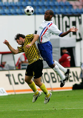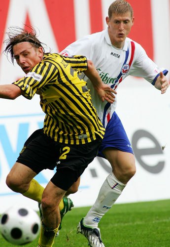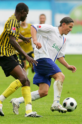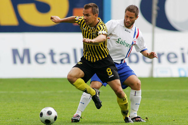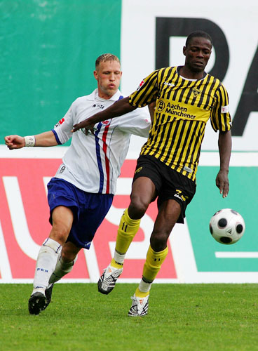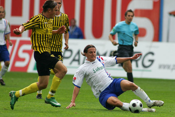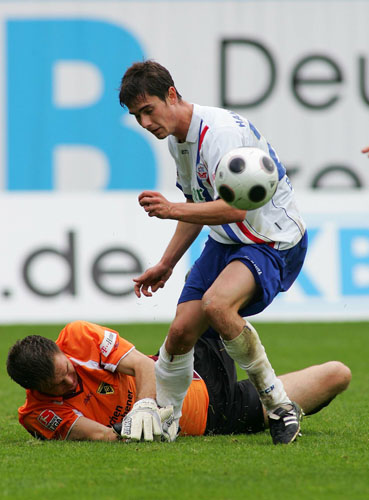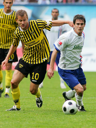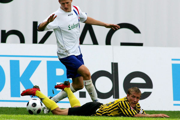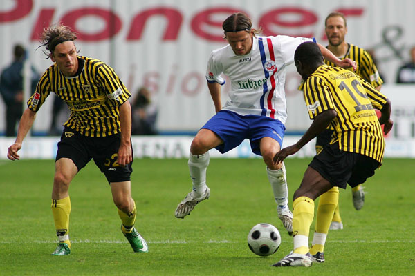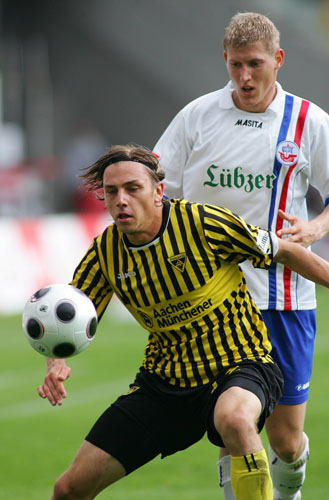Schon in der Anfangsphase zeigte sich, dass die Zuschauer in der DKB-Arena ein tolles Spiel zu sehen bekommen würden. Denn die Partie hatte alles, was das Fußballherz höher schlagen lässt: Packende Zweikämpfe, tolle Ballstafetten und Chancen im Minutentakt. Die erste gute Möglichkeit sollte jedoch auf das Rostocker Konto gehen: Nach einer Ecke von Tobias Rathgeb war Kevin Schindler mit dem Kopf zur Stelle. Nur eine Glanzparade von Thorsten Stuckmann konnte den ersten Treffer der Partie verhindern (3.). Noch keine 120 Sekunden waren vergangen, als bereits der nächste Angriff auf das Aachener Tor zurollte: Rahn hatte zu Schindler geflankt, dessen Schuss in letzter Sekunde von Ersatz-Kapitän Matthias Lehmann an den Außenpfosten gelenkt werden konnte. Aber auch die Alemannen versteckten sich nicht: Nach einem tollen Pass von Szilárd Nemeth war Patrick Milchraum allein auf weiter Flur. Da sich der Mann mit dem Turbo den Ball aber ein Stück zu weit vorgelegt hatte, konnte Hansa-Keeper Jörg Hahnel den Ball entschärfen (8.).