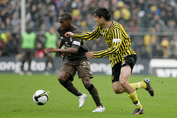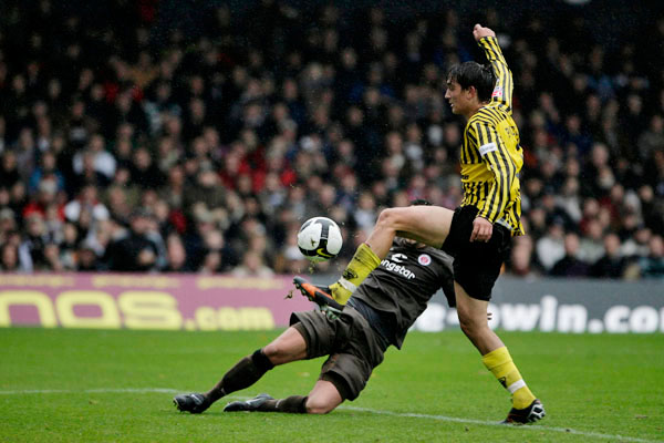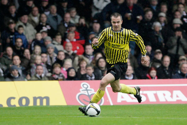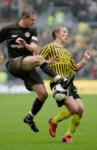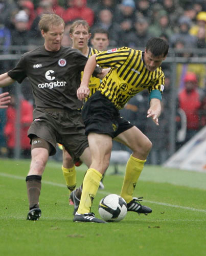 Nun war Leben im Spiel. Ein Konter von Pauli in der 16. Minute lief über rechts auf David Hoillett. Seine Flanke verfehlte Marius Ebbers nur knapp, und Achenbach konnte zur Ecke klären, die Stuckmann daraufhin noch ins Tor-Aus lenkte. In der 28. Minute leitet Torschütze Ludwig Paulis nächste gefährliche Aktion ein. Seine Ecke von der rechten Seite klärte Auer zunächst mit dem Kopf, ehe Carsten Rothenbach beim zweiten Flankenversuch von Ludwig am langen Pfosten mit dem Kopf vorbeisegelte. In der 33. Minute konnten dann endlich die 1.200 mitgereisten Schwarz-Gelben nach einem mustergültigen Konter ihrer Elf jubeln. Polenz hatte den Ball in der eigenen Hälfte erkämpft und Daun angespielt, der auf Nemeth passte. Der überlief die Pauli-Kicker und legte auf Auer ab, der die Kugel nur noch zum Ausgleich einschieben musste. Ein 1:1-Pausenstand wäre verdient gewesen. Die Alemannia hatte nach der anfänglichen Unsicherheit das Spiel über weite Strecken im Griff und überzeugte spielerisch. Aber wenige Sekunden vor Abpfiff der ersten Hälfte war es Kapitän Ebbers, der die Alemannen mit einem 1:2-Rückstand in die Kabinen schickte. Fast logisch, denn Ebbers hatte schon vor dem heutigen Spiel bereist neun Mal gegen seinen Ex-Klub getroffen. So hatten es in der ersten Hälfte die ersten und letzten Sekunden für die Schwarz-Gelben in sich.