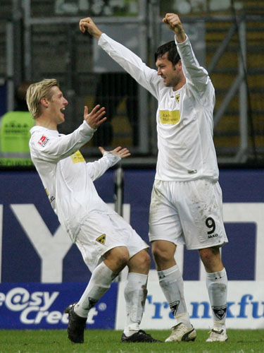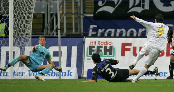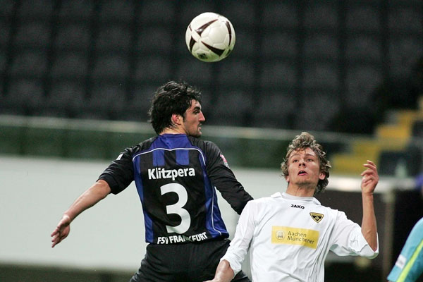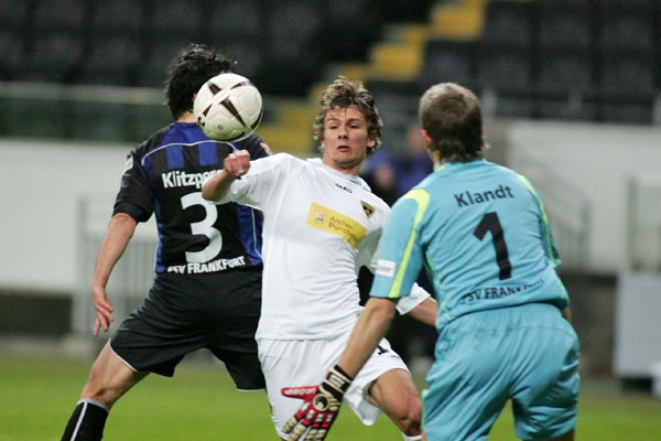 Auch in der Folgezeit überzeugten die Schwarz-Gelben durch eine cleverere Spielanlage. Die Frankfurter rannten immer wieder kopflos auf das Aachener Tor zu, die Seeberger-Elf lauerte auf Konterchancen. Eine davon sollte in der 24. Minute zu Stande kommen: Ein langer Ball segelte in den Frankfurter Sechzehner. Florian Müller reagierte blitzschnell und spitzelte das Leder an Alexander Klitzpera vorbei. Der FSV-Keeper konnte den höheren Rückstand nur mit vollem Einsatz verhindern. Symptomatisch für die Leistung des Gastgebers war der erste Torschuss. Aus rund 18 Metern rutschte Kapitän Matthias Hagner die Kugel über den Fuß, die dadurch deutlich am Aachener Gehäuse vorbei geht (35.). Im direkten Gegenzug hätte Markus Daun nachlegen können: Nach einem langen Diagonalball von Pekka Lagerblom nahm der Angreifer den Ball mustergültig an. Da der Schuss aber zu unplatziert war, konnte Klandt ihn erneut parieren. Die letzte nennenswerte Aktion in der ersten Hälfte ging ebenfalls auf das Konto der Alemannia: Eine schnelle Kombination über Fiel und Daun schloss Benny Auer ab. Da dessen Schuss aber zu ungenau war, blieb es „nur“ beim 1:0.