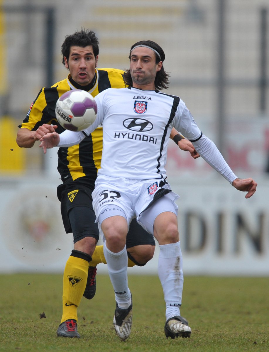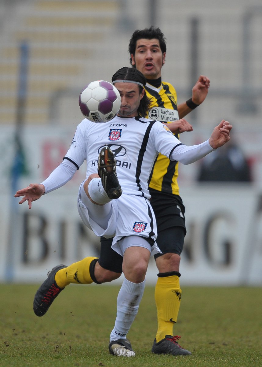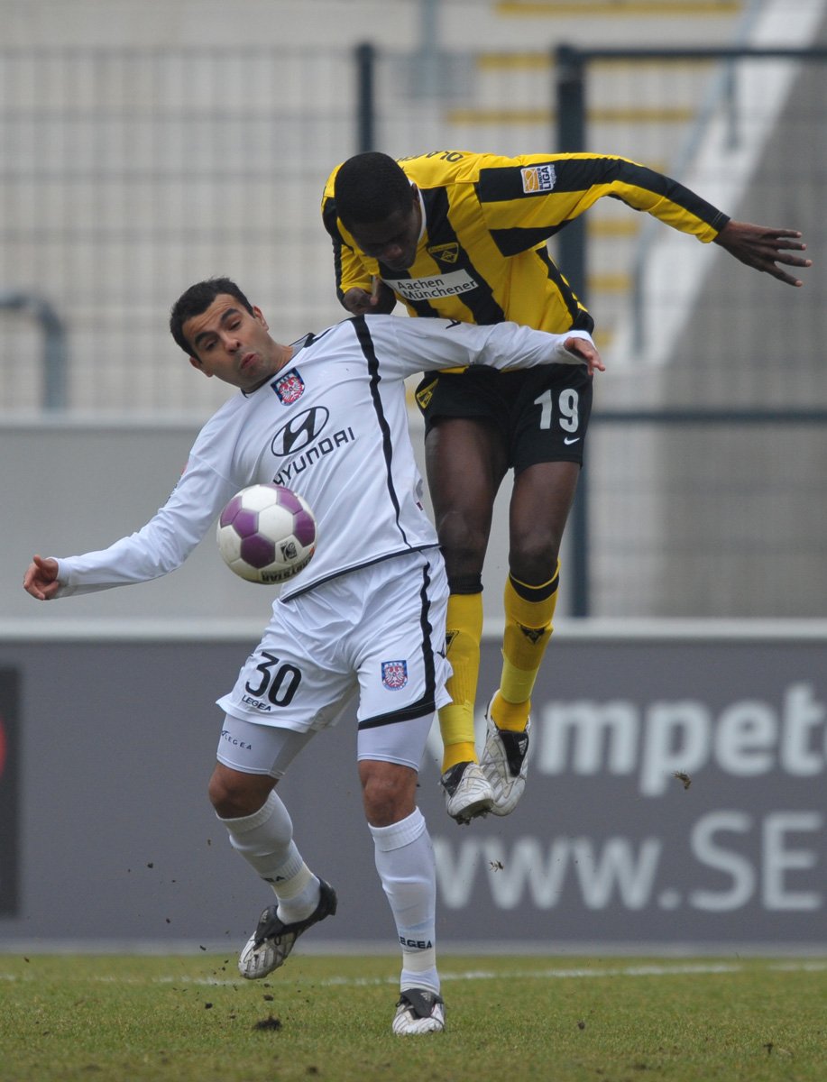 Die Alemannia ist beim FSV Frankfurt trotz einer Vielzahl guter Chancen nicht über ein 1:1 hinausgekommen. Nachdem Babacar Gueye nur das Lattenkreuz getroffen (61.) und FSV-Keeper Patric Klandt mehrere gute Chancen vereitelt hatte, köpfte Alexander Voigt Frankfurt in Führung (76.). Neun Minuten vor dem Schlusspfiff glich die Krüger-Elf aus: Ein Freistoß von Cristian Fiel landete genau auf dem Kopf von Benny Auer, der sein 8. Saisontor markierte.
