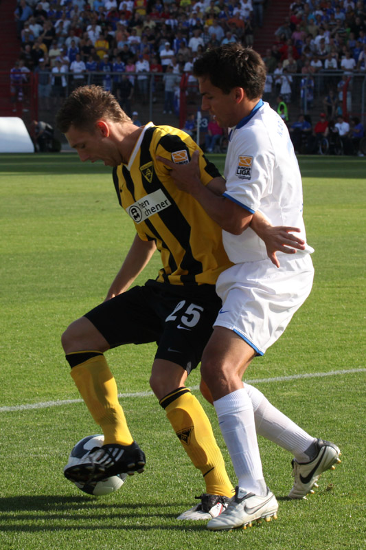 Das Spiel nahm jetzt richtig Fahrt auf. Zuerst verstolperte Lars Stindl eine gute Flanke von Michael Mutzel (22.), im Gegenzug köpfte Mirko Casper über das Gehäuse des Erstligaabsteigers. Im Anschluss versuchten die Hausherren das Kommando an sich zu reißen, doch die Fernschüsse von Stindl (26.) und Engelhardt (29.) stellten keine Gefahr dar. In den letzten 15 Minuten der ersten Hälfte lieferten sich beide Mannschaften einige verbissene Zweikämpfe im Mittelfeld, der große Schwung der ersten halben Stunde hatte sich ein wenig gelegt.