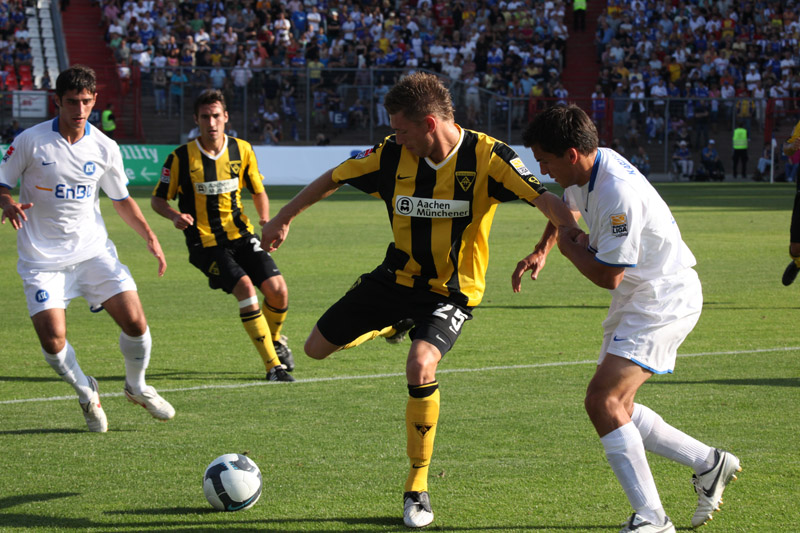 Nach dem Seitenwechsel ließen es beide Teams weiterhin etwas ruhig angehen. Deshalb fiel der Führungstreffer für die Alemannia auch wie aus dem Nichts: Florian Müller spielte auf dem linken Flügel Sebastian Langkamp schwindlig, um den Ball anschließend in die Mitte zu flanken. Dort versuchte Dino Drpic das Leder vor dem einschussbereiten Manuel Junglas zu klären. Doch dieses Unternehmen scheiterte und der Ball trudelte leicht abgefälscht ins eigene Tor - 1:0. Der KSC antwortete auf den Rückstand mit wütenden Angriffen, die jedoch nicht vernünftig durchdacht waren. Lediglich Kornetzky konnte sich auszeichnen, da er den Kopfball des eingewechselten Babacar Gueye mit einem starken Reflex parieren konnte. Im weiteren Verlauf ließen sich die Aachener jedoch zu sehr in die eigene Hälfte drängen, die Elf von Edmund Becker dominierte das Spielgeschehen. Doch wirklich gefährlich wurde es für Thorsten Stuckmann nur beim Schuss von KSC-Kapitän Alexander Iashvili (69.), der mit einem strammen Schuss unseren Keeper zu einer Faustabwehr zwang.