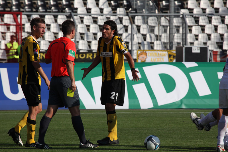 Pünktlich um 18 Uhr hatte das Warten endlich ein Ende, in der zweiten Liga rollte wieder der Ball. Die Vorfreude auf die neue Saison war besonders den Alemannen anzumerken, die in der Anfangsphase munter aufspielten und aggressiv in die Zweikämpfe gingen. Aber auch die Hausherren versuchten das Tempo trotz der sommerlichen Temperaturen hochzuhalten und so entwickelte sich ein offener Schlagabtausch. Das Einzige, was dem Spiel zu Beginn fehlte, waren die Chancen.