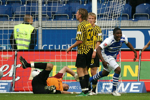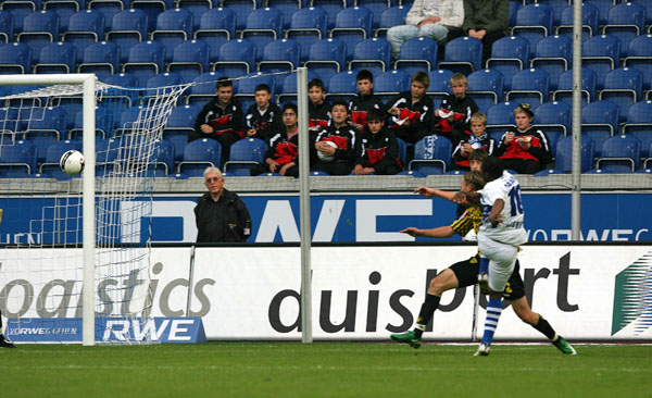 Bis auf eine Flanke von Florian Müller, die Keeper Marcel Herzog, der den verletzten Tom Starke ersetzte, mit den Fäusten abwehrte und einen Torschuss der Duisburger, den Stuckmann ohne Probleme fing, bekamen die 15.029 Zuschauern in den ersten 20 Minuten wenig geboten. In der 22. Minute hieß es dann aber Aufwachen in der Arena. Der MSV nutzte einen Ballverlust nach einem Aachener Freistoß in den Duisburger Hälfte eiskalt aus. Gregory Christ spielte Cedric Makiadi frei, der alleine vor Stuckmann die Nerven behielt und den 1:0 Führungstreffer erzielte. Wenige Minuten nach dem Führungstreffer waren es nun die Schwarz-Gelben, die für Gefahr vor dem gegnerischen Tor sorgten. Lewis Holtby, der am Vortag seinen 18. Geburtstag gefeiert hatte, vergab die Chance, sich sein eigenes Geschenk zu bereiten: Seinen Schuss aus zehn Metern drehte Herzog um den Pfosten.