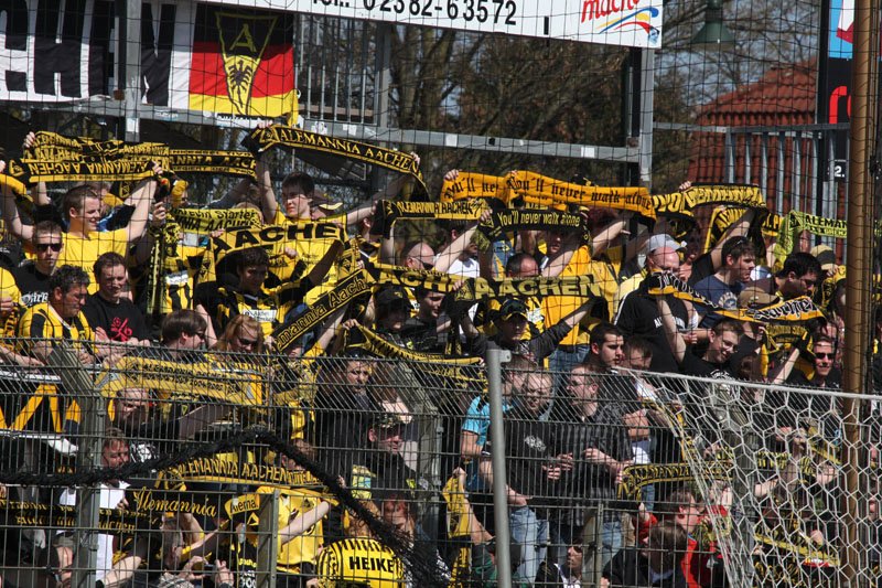 Das Mitbringen von Doppelhaltern und Schwenkfahnen ist verboten. Kleine Schwenkfahnen bis zu einer Länge von 1,80 Metern und Trommeln, die einsehbar sind, sind erlaubt. Außerdem darf ein Megaphon mitgebracht werden. Dieses muss im Vorfeld bei Alemannias Fanbeauftragtem Robert Jacobs (robert.jacobs@alemannia-aachen.de) angemeldet werden. Zaunfahnen dürfen nur hinter dem Block angebracht werden.