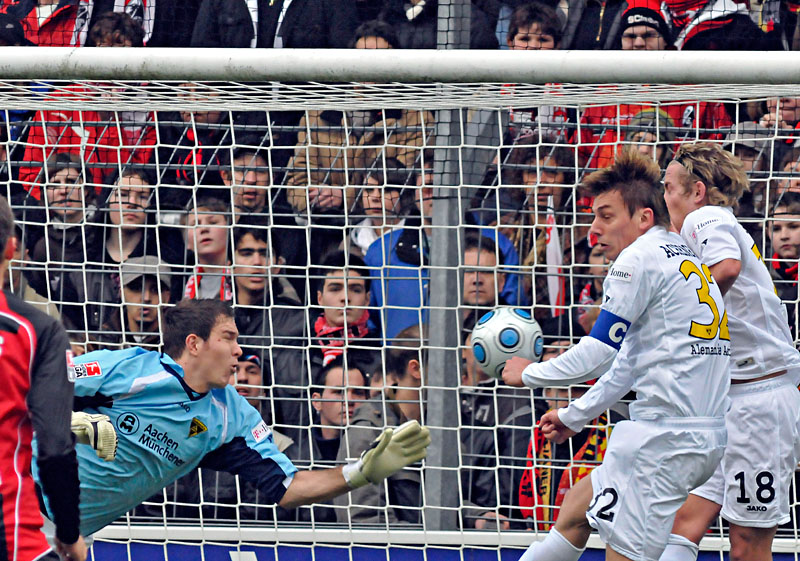 Die erste Offensivaktion der Seeberger-Elf sollte auch die letzte für eine lange Zeit bleiben. Denn die Freiburger drängten die Alemannen immer wieder in die eigene Hälfte, der Sturmlauf des Sportclubs hatte begonnen. Den Lohn holte sich die Dutt-Elf in der 11. Minute ab: Den Eckball von Julian Schuster unterlief Stuckmann, Ömer Toprak lauerte am langen Pfosten und versenkte den Ball per Kopf zum 1:0. In der Folgezeit standen die Alemannen unter Schock, die Freiburger spielten sich in einen wahren Rausch. Zwischenzeitlich fingen die SC-Akteure sogar an zu zaubern: Schuster lupfte nach einem Freistoß den Ball kurz für Schwaab an, die Volleyabnahme parierte Stuckmann (28.). Nur drei Minuten später wäre Aachens Keeper machtlos gewesen, wenn Mohamadou Idrissou seine Volleyabnahme einen Meter tiefer angesetzt hätte. Auch in der letzten Viertelstunde spielte nur eine Mannschaft: der Sportclub. Kurz vor dem Ende der ersten Hälfte musste Stuckmann mit einem starken Reflex sogar das 2:0 verhindern: Den Kopfball konnte Aachens Keeper für seine indisponierten Vorderleute in höchster Not klären.