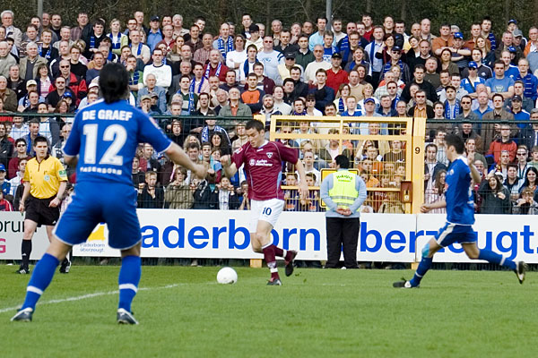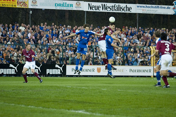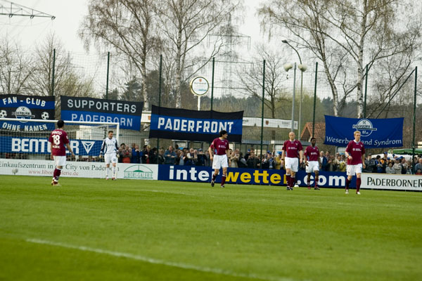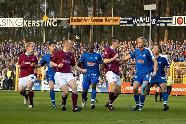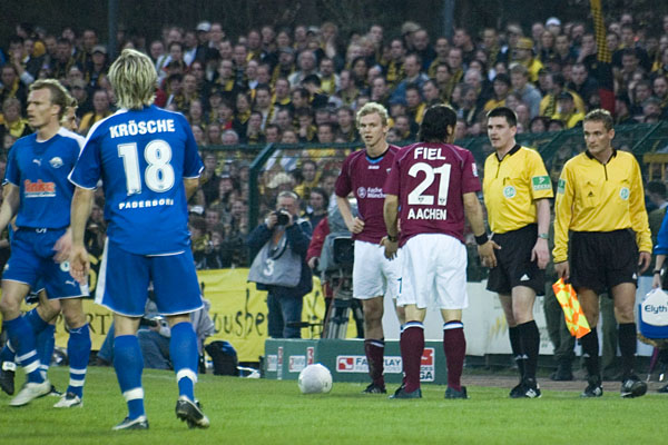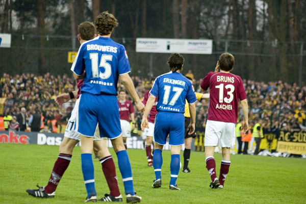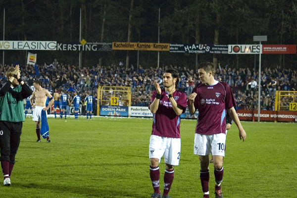 Zur Pause brachte Hecking den schnellen Florian Bruns für Sichone. Nach wenigen Minuten schwächte sich die Alemannia wiederum selbst. Der bereits verwarnte Matze Heidrich ging im Mittelfeld zu rustikal zu Werke, Lupp zückte die Gelb-Rote Karte (53.). Hecking reagierte prompt und brachte Cristian Fiel für Marius Ebbers. Paradoxerweise gelang es dem Team, mit Neun gegen Elf die Partie zu beruhigen. Von den Paderbornern war nicht mehr viel zu sehen, lediglich kurz vor Schluss kam Müller zur einzig nennenswerten Szene nach der Pause. „Wir hätten den Ball viel schneller laufen lassen müssen“, kritisierte Coach Jos Luhukay, der sich ansonsten über den endgültig perfekten Klassenerhalt freuen konnte.
