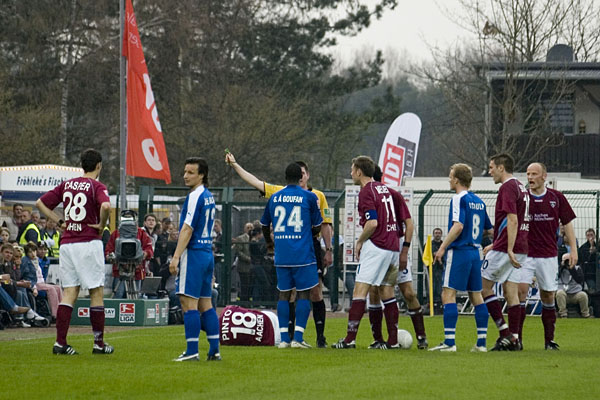 Als sich die Nickligkeiten häüften und Schiedsrichter Lupp mit vielen Gelben Karten durchgriff, gingen Jan Schlaudraff die Nerven durch. Als schon abgepfiffen war, holte er Müller von den Beinen und sah die Rote Karte. Es wurde hektisch, und auch Moses Sichone konnte sich dem nicht entziehen. Ballverlust an der Mittellinie, schneller Konter, und Müller musste den quer gelegten Ball nur noch zum 3:1 über die Linie drücken (42.). Kurz vor dem Pausenpfiff verdiente sich auch Gouiffe à Goufan mit einem rüden Foul die Gelb-Rote Karte. Lupp traute sich aber nicht, den Mittelfeldspieler ebenfalls vom Platz zu stellen.