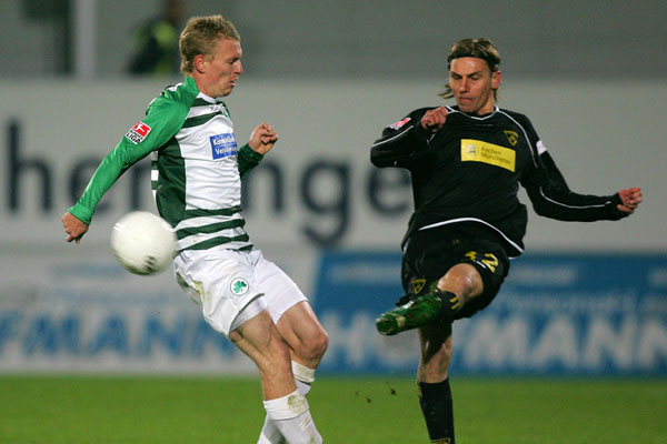 „Ich denke, wir haben ein hoch attraktives Spiel gesehen, das auch 4:4 hätte ausgehen können“, kommentierte Coach Jürgen Seeberger die 90 Minuten am Fürther Ronhof. „Insgesamt hatte Fürth mehr Spielanteile, was man auch am Ballbesitz von 63 Prozent erkennen kann. Aber wir hatten vor der Pause genug Chancen, das zweite oder gar dritte Tor zu erzielen“, so der Coach, der sich über das Zustandekommen des Gegentores ärgerte. „Wir rücken raus, da darf Allagui natürlich nicht zum Kopfball kommen“, ärgerte sich Seeberger. Thomas Stehle war am Ende „richtig froh über den Abpfiff. Es war unheimlich schwer, gegen die beiden Stürmer zu spielen. Sie sind immer in die Schnittstellen gegangen, waren ständig unterwegs. Mit dem Punkt können wir gut leben.“ So sah es auch Kapitän Reiner Plaßhenrich: „Wir haben unsere Auswärtspunktzahl verdoppelt“, scherzte der Mittelfeldspieler. „Wir müssen dahin kommen, dass wir auswärts auch mal die Null halten. Dann kommt der erste Sieg von alleine.“ Fehlt nur noch die Schilderung des Torschützen: „Es war eine Eckenvariante. Ich habe früh gesehen, dass der Ball in meine Richtung kommt. Und dann habe ich mein linkes Schwert ausgepackt“, erklärte ein lachender Thomas Stehle.