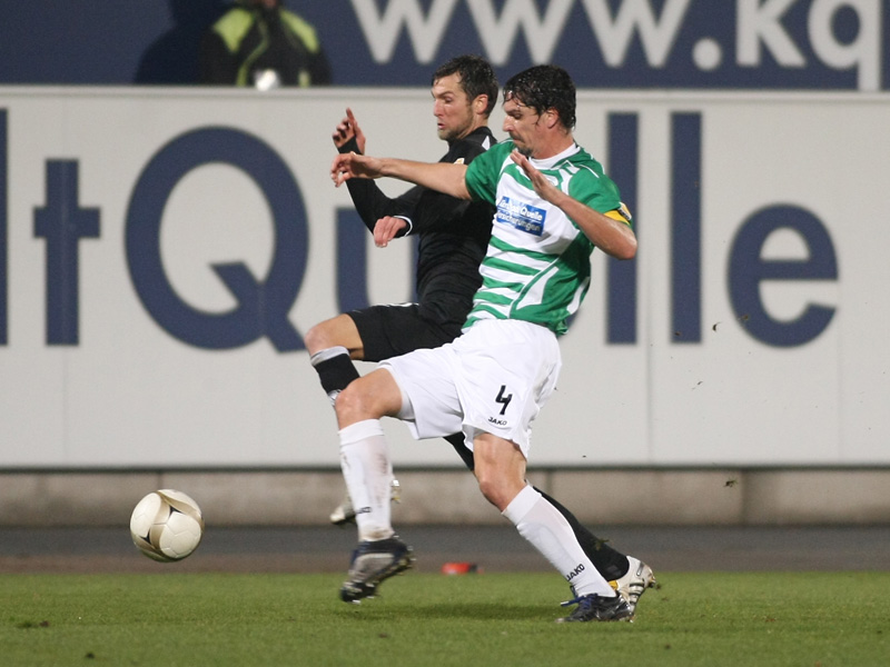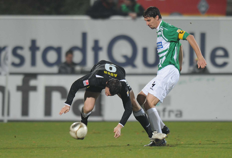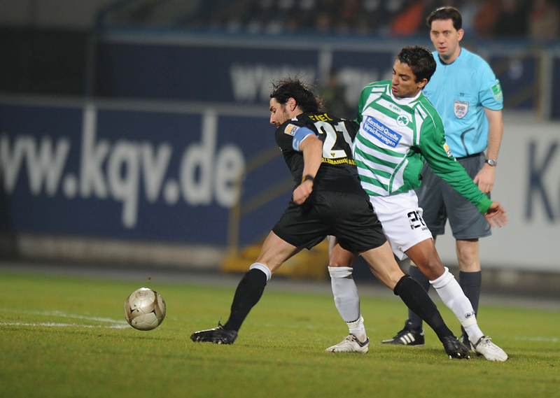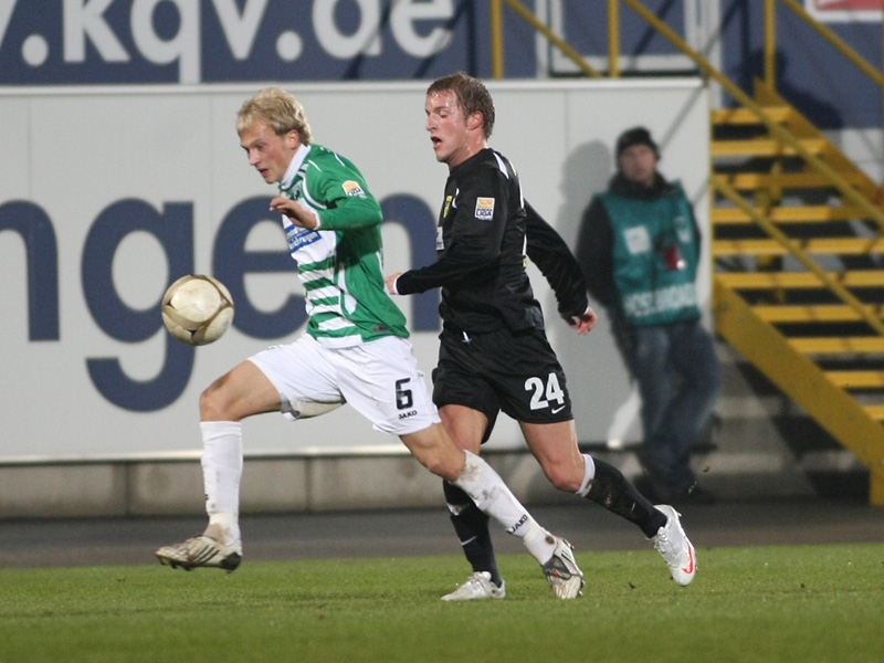 Bei der Spielvereinigung jagte jetzt ein Fehlpass den nächsten. Die allgemeine Verunsicherung versuchte die Krüger-Elf zu nutzen: Nach schönem Pass von Burkhardt versprang Benny Auer der Ball, so dass das Leder deutlich über das Franken-Tor ging (31.). Da aus dem Spiel heraus bei Fürth nicht viel passte, versuchte es Youssef Mokhtari mit einem Freistoß: Aus 25 Metern zirkelte er den Ball knapp am Aachener Gehäuse vorbei (39.). Den einzigen Rückschlag, den die Schwarz-Gelben im ersten Durchgang hinnehmen mussten, war der Ausfall des starken Thorsten Burkhardt: Der starke „Zehner“ musste mit einer Verletzung am hinteren Oberschenkel ausgewechselt werden. Für ihn kam Kevin Kratz in die Partie (42.).