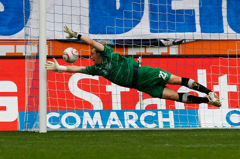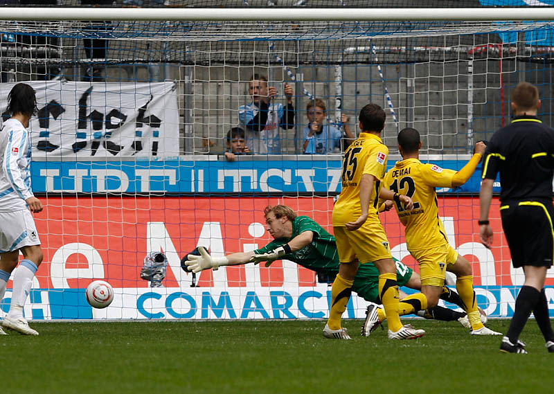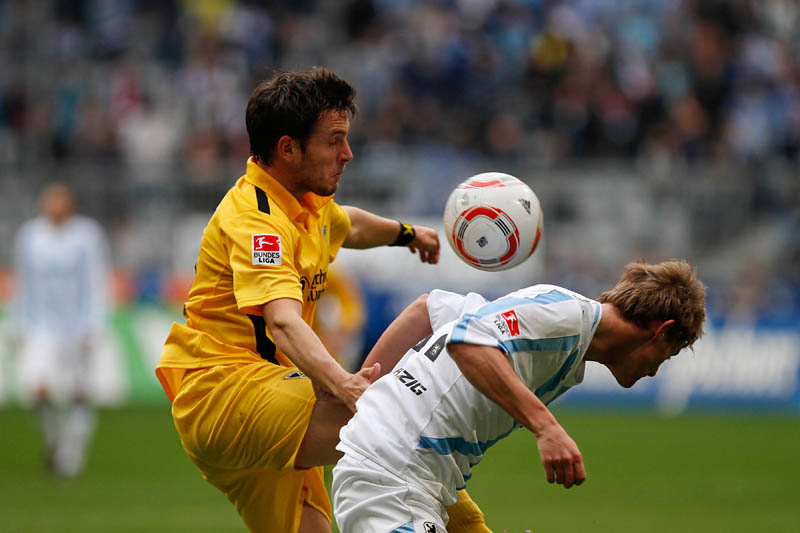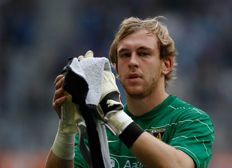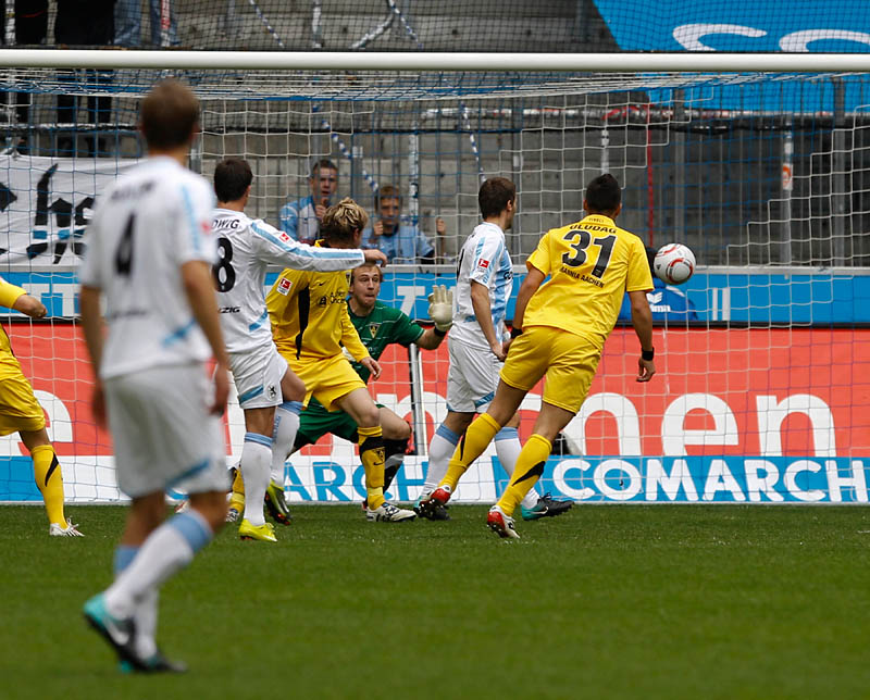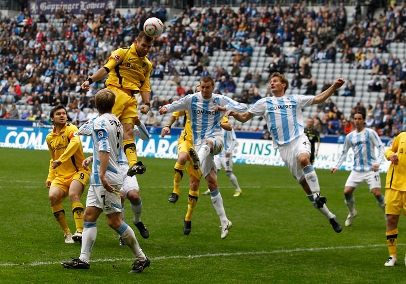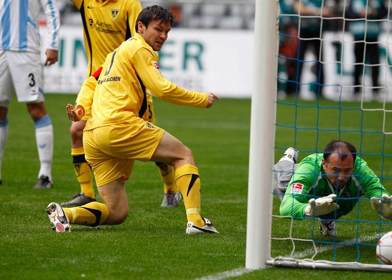 Es war das Duell zweier Teams, die in der Liga momentan richtig gut unterwegs sind und seit langer Zeit nicht mehr als Verlierer vom Platz gingen. Und es sah sehr früh danach aus, als wenn die Serie der Alemannia auch in der Allianz-Arena anhalten würde. Die Schwarz-Gelben erwischten den perfekten Start: Achenbach setzte sich in der achten Spielminute im Zweikampf gegen Halfar stark durch, bediente Stieber auf der linken Seite dessen Flanke mal wieder seinen Sturmpartner Benny Auer fand. Scheiterte Aachens Kapitän zunächst per Kopf an Kiraly, so markierte er im Nachstochern die frühe Führung – 1:0.