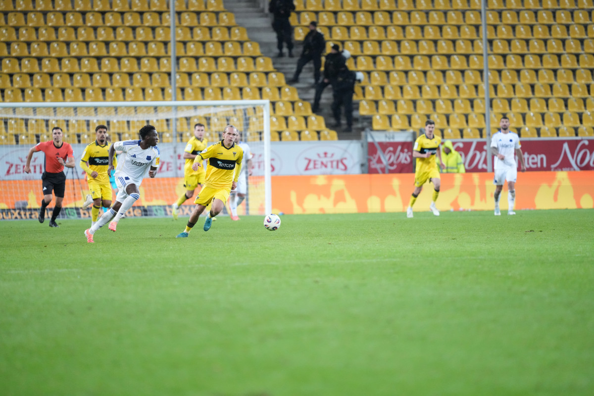 Wenig später war Olschowsky aber geschlagen. Nach einem Eckball von Florian Pick köpfte Kamara zum vermeintlichen Ausgleich ein, aber die Fahne des Schiedsrichters ging sofort los – der Saarbrücker Spieler stand knapp im Abseits (14.). Beim nächsten Freistoß von Pick war die Alemannia dann erneut im Glück. Nach der Hereingabe foulte Elekwa Kamara im Sechzehner Kamara – doch die Pfeife des Schiedsrichters blieb stumm (20.).