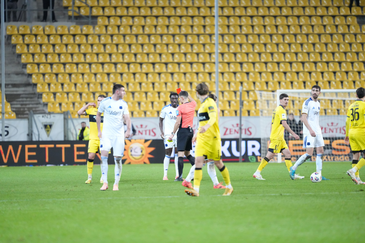Der Schuss von Lorch fand seinen Weg zwar nicht ins Tor, leitete aber gleichzeitig eine Phase ein, in der der Alemannia immer öfters Entlastungsangriffe gelangen. So verzog Schroers nach Zuspiel von Sulejmani nur knapp (73.). Wenig später sah Kamara die Ampelkarte, nachdem er Mehdi Loune foulte (80.). In Überzahl hielt die Alemannia die Gastmannschaft lange Zeit erfolgreich vom eigenen Tor fern. Der Ball lief gut durch die eigenen Reihen, doch die Aachener verpassten die Entscheidung. So scheiterte Gindorf mit seinem Flachschuss an Phillip Menzel (87.). Stattdessen musste Olschowsky noch einmal eine hochkarätige Chance entschärfen: Nach einem Eckball setzte sich Brünker im Luftduell durch, doch der Keeper lenkte den Kopfball noch um den Pfosten (90.+7).