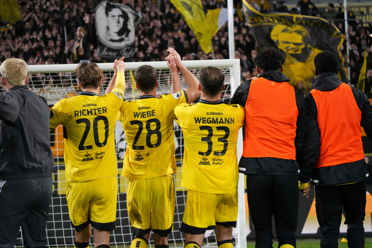 Alemannia Aachen: Olschowsky – Nadjombe (86. Strujic), Wegmann, Yarbrough (57. Ademi), Meyer – Bahn (76. Richter), Wiebe, Lorch (76. Loune), Schroers – Elekwa (57. Sulejmani), Gindorf / Trainer: Ilyas Trenz