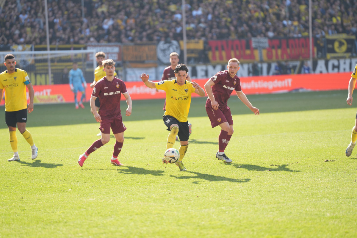 Beste Voraussetzungen für einen spannungsvollen Fußball-Nachmittag boten sich an diesem Samstag an der Krefelder Straße: Die Sonne schien, der Tivoli war vollbepackt und die Alemannia hatte nach dem Halbfinaleinzug im Bitburger-Pokal in Düren wieder eine etwas breitere Brust bekommen. Coach Heiner Backhaus wartete im Duell mit dem von 3000 Anhängern begleiteten Tabellenführer Dynamo Dresden unter anderem wieder mit Jan Olschowsky im Tor auf, ebenso kehrte Soufiane El-Faouzi in die Anfangsformation zurück. Baxter Bahn startete auf der Achter- respektive Zehnerposition, Anton Heinz und Anas Bakhat bildeten die Doppelspitze.