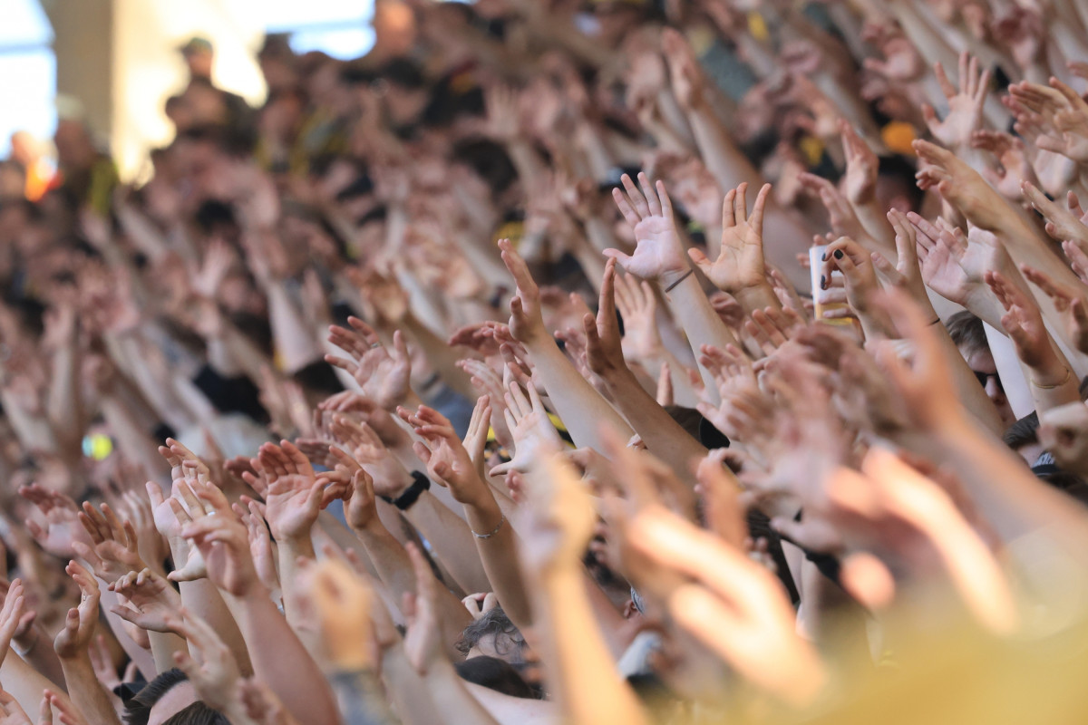 In den Stehplatz-Blöcken muss dringend darauf geachtet werden, dass die Treppenaufgänge aus Sicherheitsgründen unbedingt freigehalten werden müssen!
