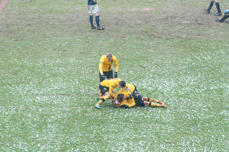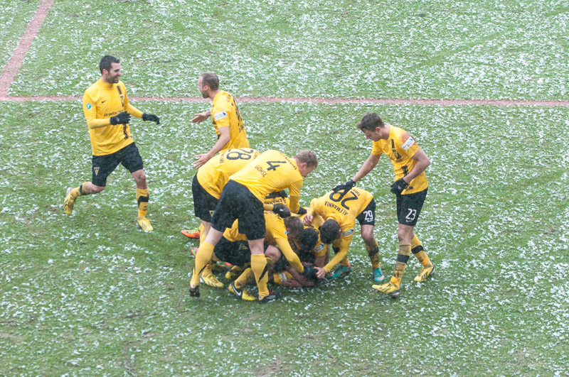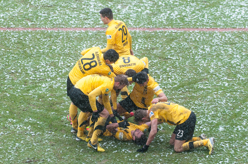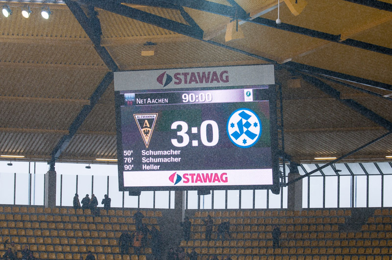 Erneut war Thiele der Wegbereiter für Schumacher, der seinen Gegenspieler aussteigen ließ und die Kugel dann aus sieben Metern zum 2:0 einschoss (76.). Die Alemannia blieb am Drücker. Strujic schickte Heller auf die Reise, der aus spitzem Winkel nur die Latte traf (87.). Abgerundet wurde der perfekte Auftritt in der Nachspielzeit. Thiele verlängere das Leder mit dem Hinterkopf in den Lauf von Heller, der diesmal genauer zielte und zum 3:0 vollendete (90+1.). „Oh, wie ist das schön“, schallte es von den Rängen. Der höchste Saisonsieg war unter Dach und Fach und die Alemannia vergrößerte den Vorsprung auf die Abstiegsränge als Tabellenfünfzehnter auf drei Punkte.