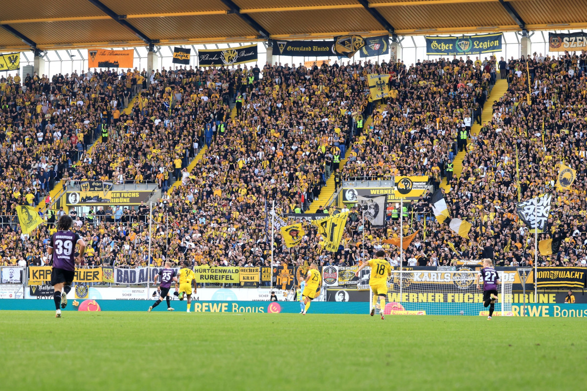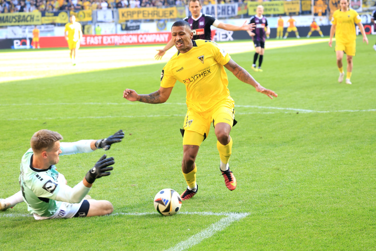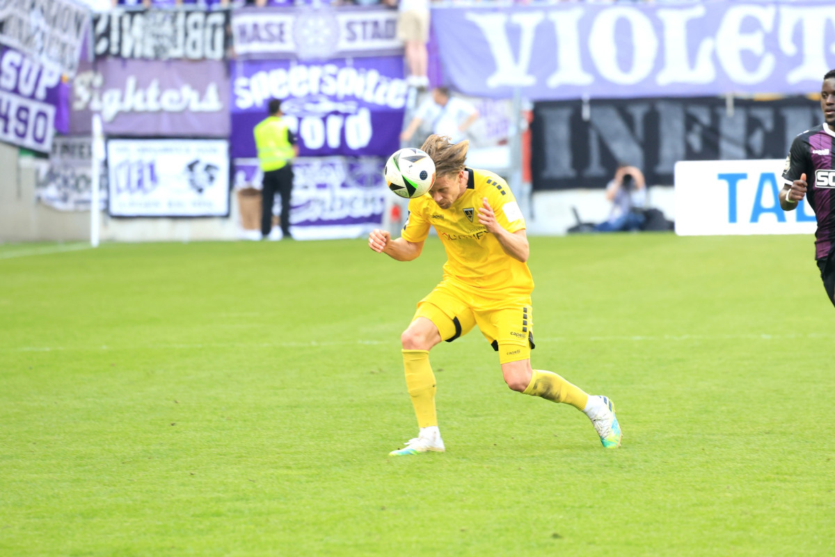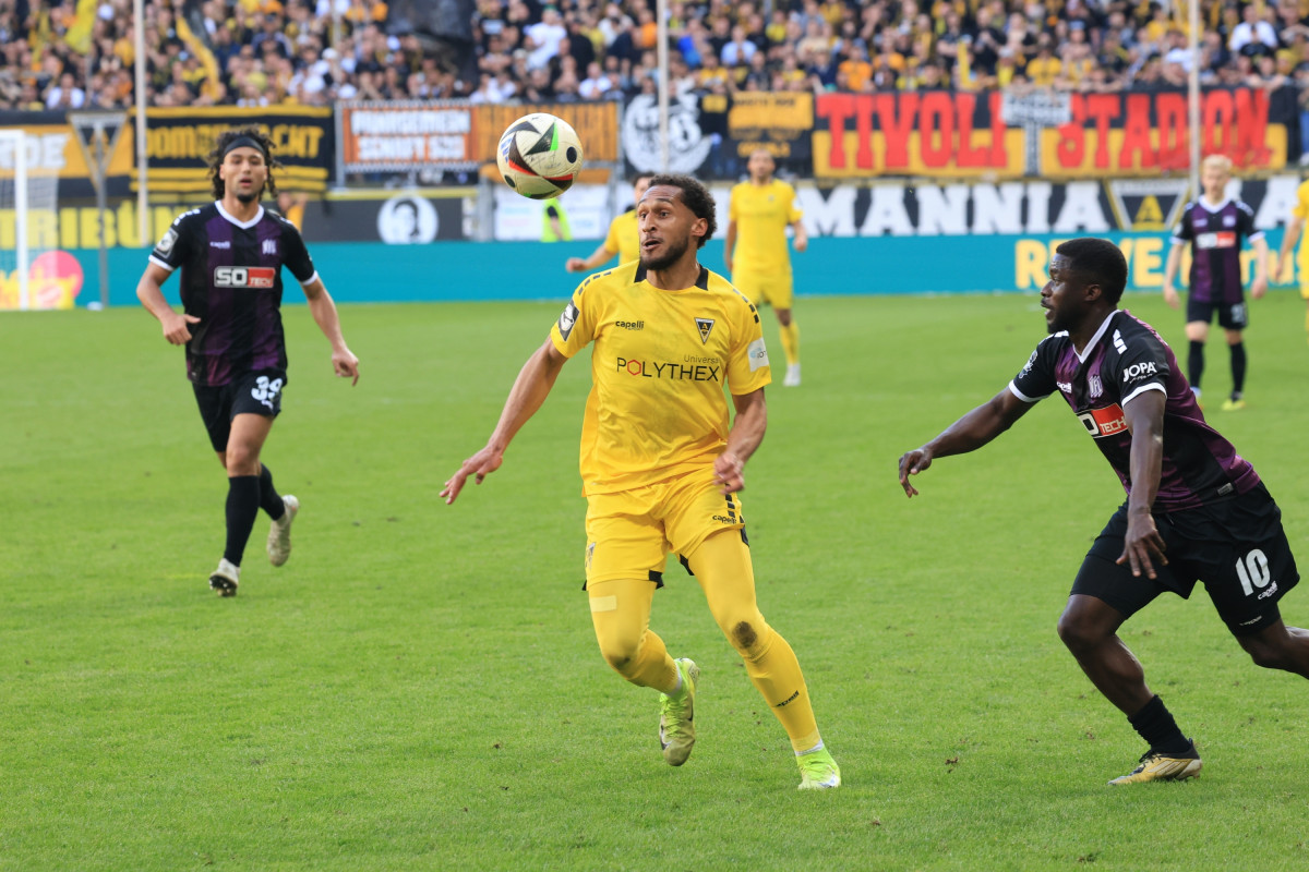 Die Schwarz-Gelben verströmten dennoch mehr Spielfreude und Intensität, blieben weiterhin die klar bessere Mannschaft. Der wie immer umtriebige El-Faouzi setzte den nächsten Stich und überraschte VfL-Keeper Jonsson mit einem Schuss auf das kurze Eck, den der Schlussmann gerade so zur Ecke klären konnte (29.). Der Druck der Hausherren wuchs – und war eine Minute später auch auf der Anzeigetafel zu sehen. Bahn in seinem 300. Drittligaspiel flankte nach einem kurz ausgeführten Freistoß aus dem rechten Halbfeld vor den Kasten, wo Kapitän Hanraths per Kopfball-Bogenlampe ins lange rechte Eck traf – der umjubelte Führungstreffer im Abstiegskampf-Duell und das erste Saisontor des Spielführers (30.)!