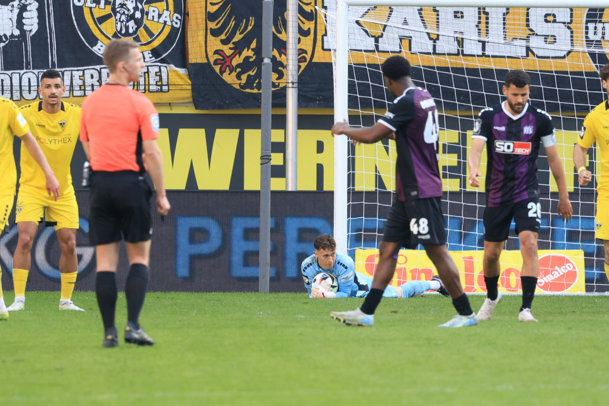 Schwarz-Gelb blieb weiter am Drücker, Osnabrück kam nicht zur Entfaltung und wurde früh gestört. So auch acht Minuten nach dem 1:0, als Wiebe ein unüberlegtes Zuspiel von Torwart Jonsson abfing und direkt auf Bakhat weitergab. Der setzte zum Lupfer über den weit vor dem Kasten stehenden Schlussmann an, doch dieser konnte das Spielgerät gerade so zur Ecke wischen (38.). Und Osnabrück kam gegen überlegene Alemannen abermals in Verlegenheit: Gaudino steckte durch zu Bahn, der durchgebrochen war, aus spitzem Winkel direkt vor dem Tor aber nur drüber schoss (42.). Dann war Pause in einer Partie, die bis dato nur eine Richtung kannte – geradewegs auf das Gästetor zu. In den Katakomben kam es dann noch zu einer unschönen Szene: VfL-Trainer Marco Antwerpen sah wegen wiederholten Meckerns Gelb-Rot und musste die zweite Hälfte auf der Tribüne verbringen.