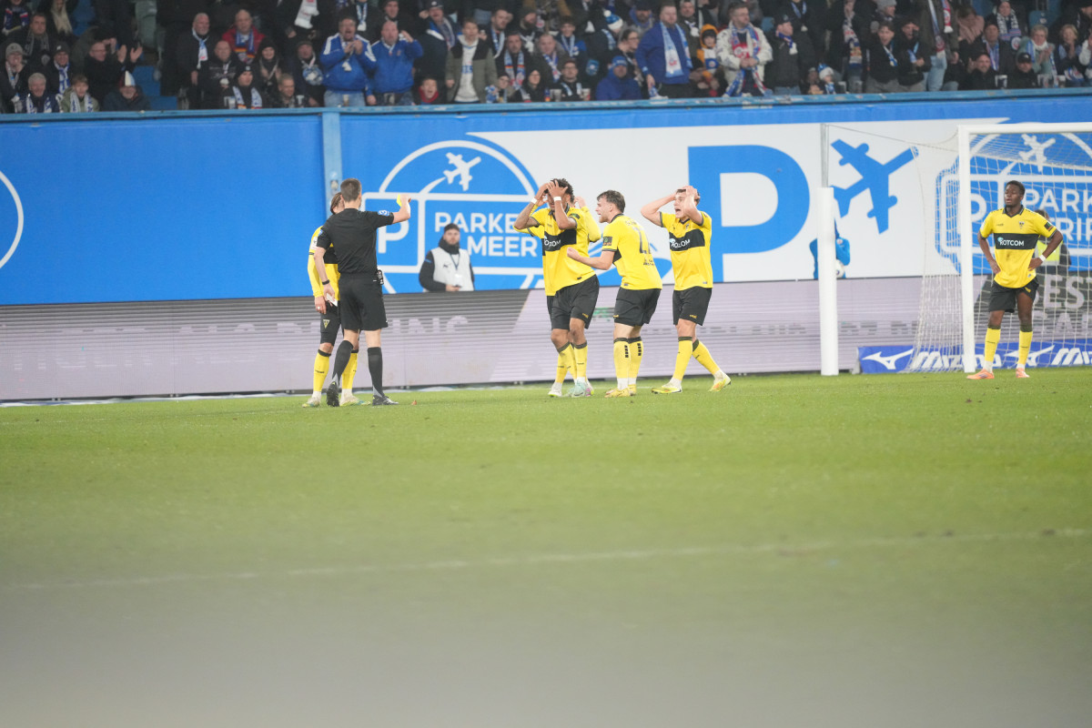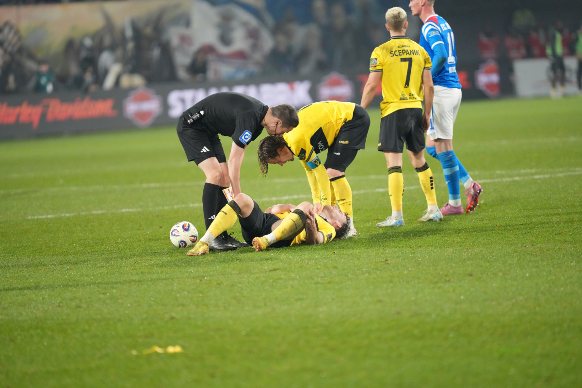Früh im Spiel gab es dann den ersten großen Aufreger. Im Zweikampf mit Andreas Voglsammer bekam Wiebe den Ball nach Ansicht von Schiedsrichter Daniel Bartnitzki an den Arm und verhinderte somit eine klare Torchance. Wiebe sah daraufhin die Rote Karte – eine Fehlentscheidung, da der Aachener den Ball an den Rücken bekam (10.). Die Alemannen ließen sich vom Platzverweis aber nicht schocken und verteidigten leidenschaftlich. Und so ging die erste große Chance der Partie auf das Konto der Kaiserstädter, nachdem Pierre Nadjombe nach Zuspiel von Ademi beinahe die Schwarz-Gelbe Führung markiert hätte, doch Viktor Bergh klärte gerade noch per Grätsche (17.).