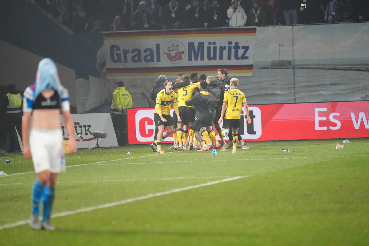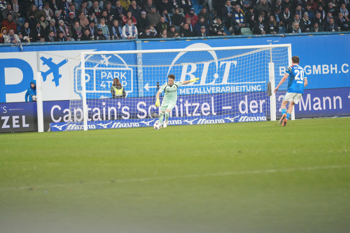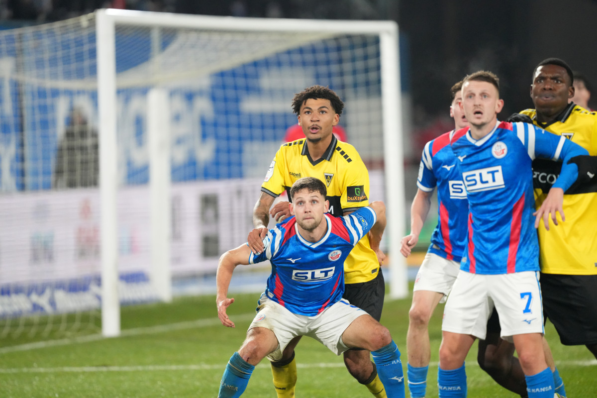 Gefährlicher wurden die Rostocker dagegen aus dem Spiel heraus. Nach einem Hackenpass von Ryan Naderi tauchte Emil Holten frei vor Olschowsky auf. Sein Schuss aus gut elf Metern war aber zu ungenau und so begrub der Aachener Keeper den Ball unter sich (75.). Nur drei Zeigerumdrehungen später hatte erneut Holten die große Chance per Kopf und verfehlte das Tor denkbar knapp (79.).