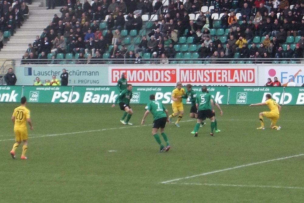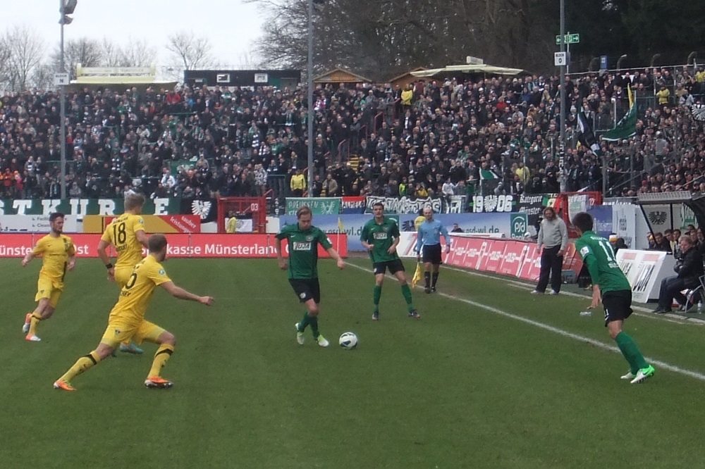 Die Alemannia muss im Abstiegsrennen einen weiteren Rückschlag hinnehmen. Beim SC Preußen Münster unterlagen die Schützlinge von René van Eck nach einem besonders im ersten Spielabschnitt beherzten Auftritt am Ende deutlich mit 1:4 (0:1). Vor der gelb-roten Karte von Oguzhan Kefkir (37.) hatten die Schwarz-Gelben zahlreiche Torchancen zur Führung nicht nutzen können.