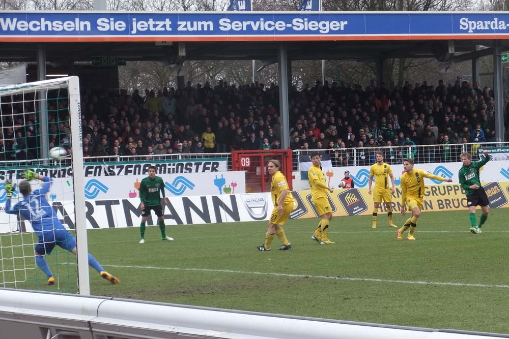 Die 8.089 Zuschauer im Preußen-Stadion dürften sich in den ersten Minuten verwundert die Augen gerieben haben. Es waren nicht die heimstarken Gastgeber, die als einziges Team in der 3. Liga zu Hause noch unbesiegt sind, die zu klaren Torchancen kamen. Nach einer Rechtsecke von Strujic eröffnete Murakami das Aachener Chancenreigen. Der Kopfball des Japaners ging nur um Zentimeter am linken Pfosten vorbei (15.). Danach narrte Thiele die Münsteraner Hintermannschaft und legte mustergültig für Kefkir auf. Der Linksfuß zögerte etwas zu lange und sein Schuss konnte in letzter Sekunde noch auf der Torlinie abgewehrt werden (19.). Die nächste Gelegenheit hatte Strujic, der einen Schuss aus 20 Metern knapp rechts am Tor der Gastgeber vorbeisetzte (26.).