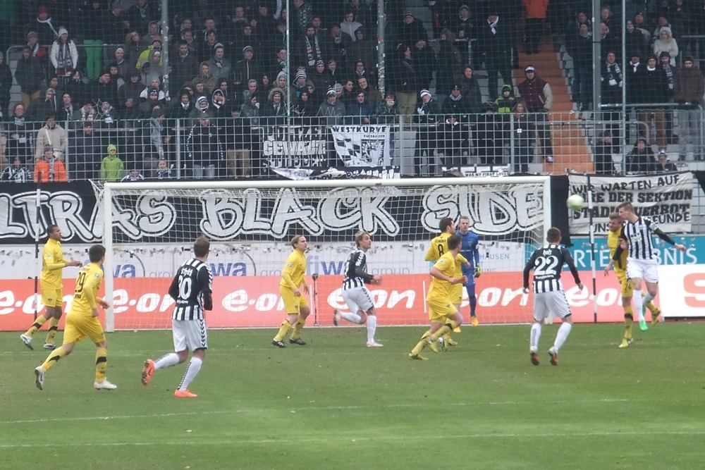 Das Spiel begann aus Aachener Sicht verheißungsvoll. Bereits nach sechs Minuten wurde Marquet von Brauer in die Tiefe frei gespielt. Der Angreifer fackelte nicht lange und zog aus 18 Metern ab. Wacker-Keeper Vollath konnte mit einer Faustabwehr die frühe Aachener Führung so gerade noch verhindern. Dann rannte Thiele über die linke Seite auf und davon und wurde von Keeper Vollath zu Fall gebracht. Das Tor war leer und Drevina schob das Leder aus 16 Metern daneben. Bereits in den Vorwochen sollte sich die mangelnde Chancenverwertung rächen. Luz konnte von Schaffrath nicht an einer Hereingabe von der linken Seite gehindert werden. Herröder und Flekken behinderten sich vor dem Tor gegenseitig und die Kugel kullerte ohne weitere Berührung zum 1:0 über die Linie (17.).