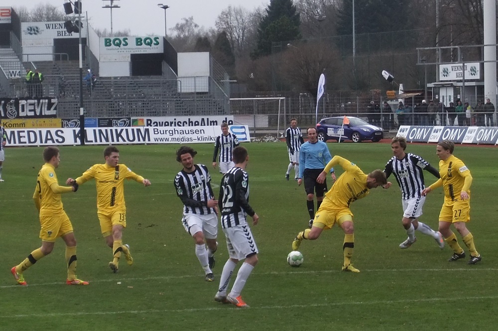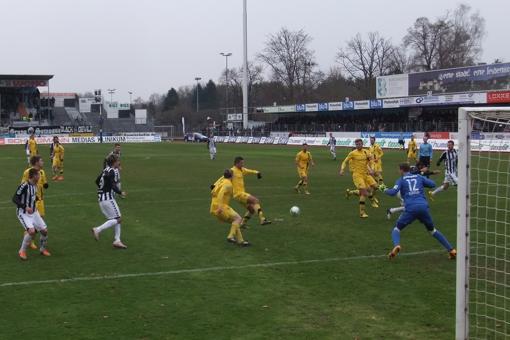 Nach einer guten halben Stunde warf sich Herröder in einen Schuss von Burkhardt und konnte so einen Torerfolg des Ex-Alemannen in letzter Sekunde noch verhindern. Dass die Gastgeber nur zwei Minuten später ihren Vorsprung dennoch ausbauen konnten, war erneut Aachener Schützenhilfe zu verdanken. Die Abwehr bekam den Ball nicht aus der Gefahrenzone und Strujic stocherte das Leder bei seinem Rettungsversuch aus zwölf Metern vorbei an Flekken 2:0 ins eigene Netz (34.). Bereits das dritte Eigentor im dritten aufeinanderfolgenden Spiel! Kurz vor dem Seitenwechsel vergab Heller die Chance zum Anschlusstreffer. Nach einer Flanke von Andersen köpfte der Angreifer die Kugel aus sieben Metern genau in die Arme des Burghausener Torhüters (42.).