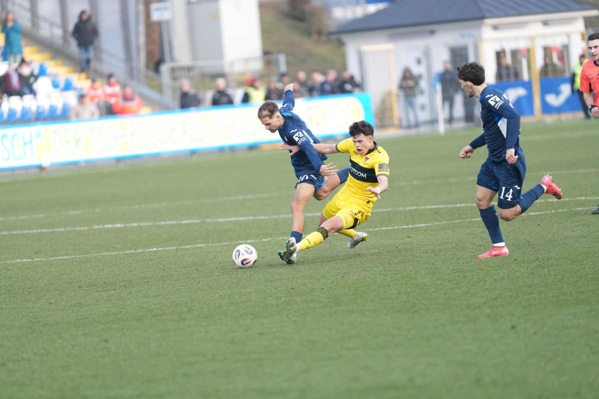 Nach der überstandenen Druckphase nahmen die Aachener das Heft des Handelns wieder in die Hand. Nach Zuspiel von Gindorf hatte Schroers die Führung auf dem Fuß. Er umrundete den Keeper, geriet beim Abschluss aber in Rücklage, weswegen sein Schuss über das Tor flog (31.). Wenig später war es dann aber soweit. Wieder kam Schroers nach Zuspiel von Gindorf im Strafraum an den Ball. Nach einer tollen Einzelaktion erzielte er mit einem satten Schuss das 1:0 für die Schwarz-Gelben (36.).