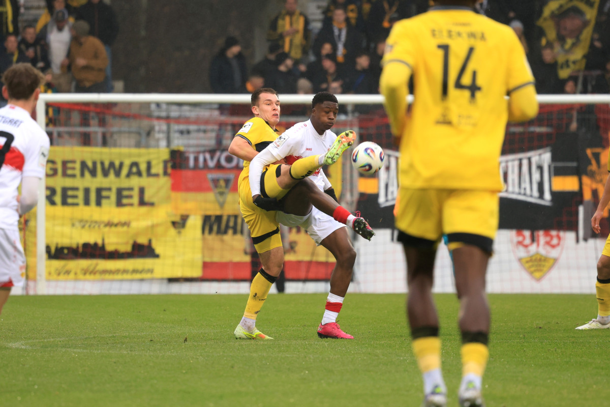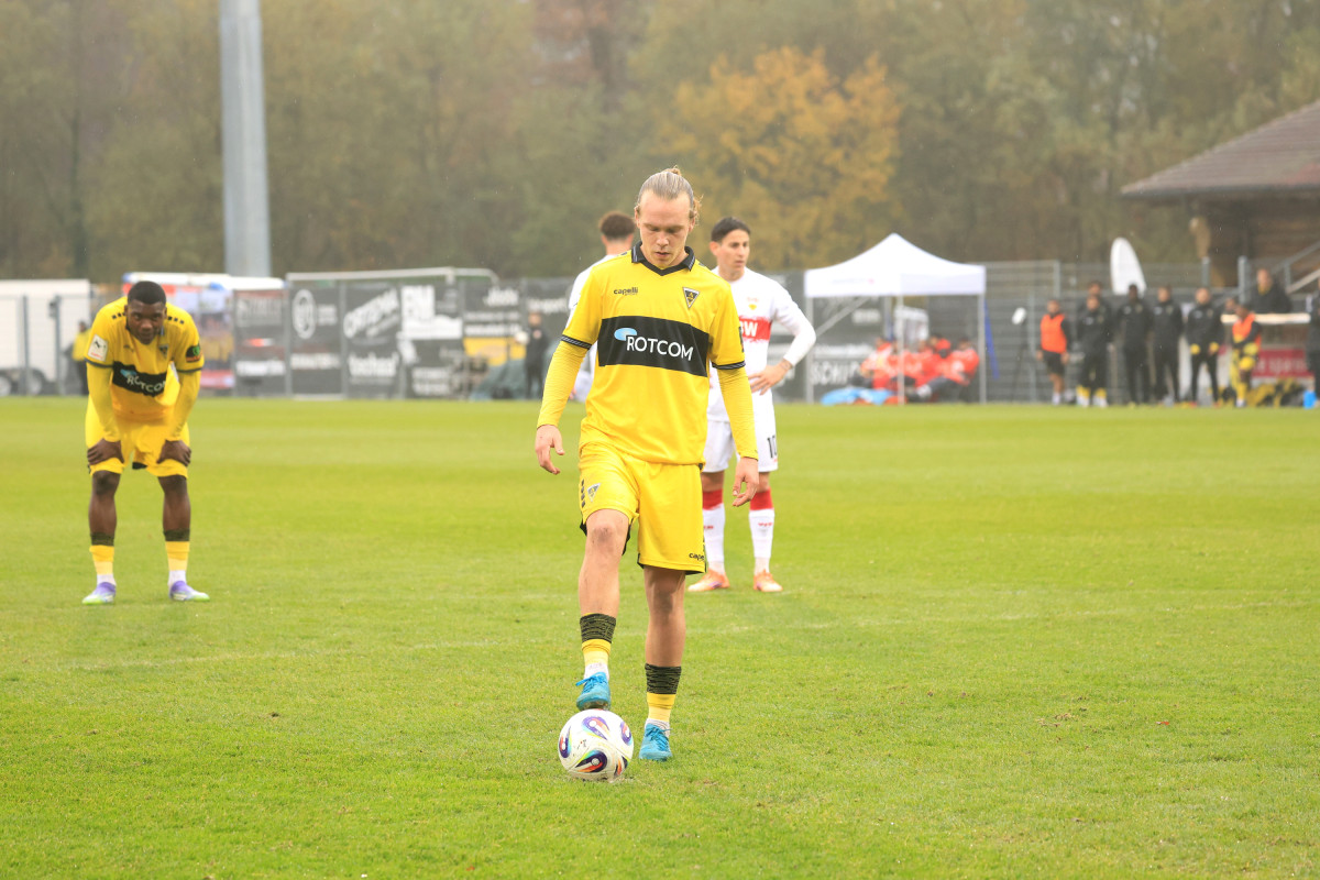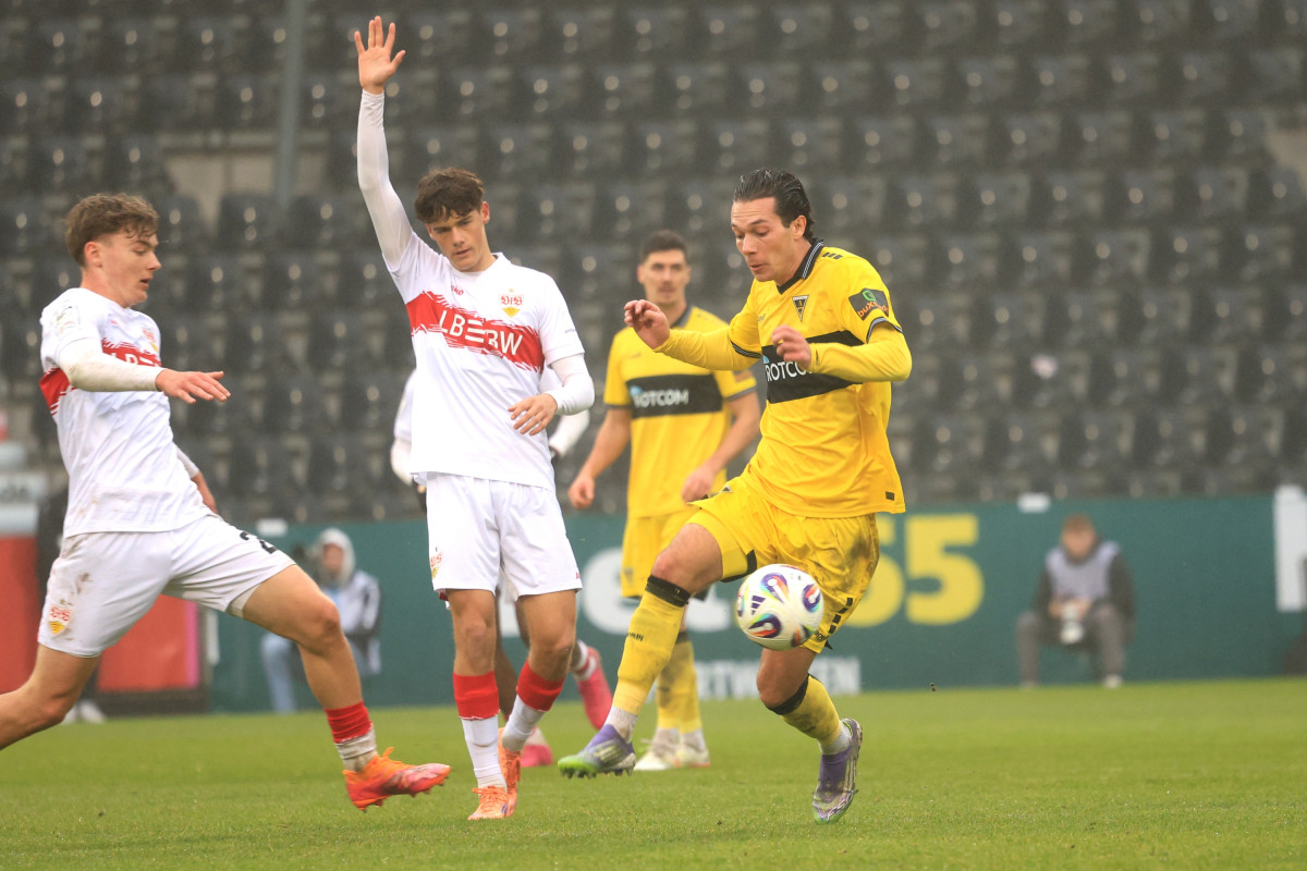 Und die Aachener Verteidigung hatte zu Beginn des Spiels ihre liebe Mühe, mit den jungen Stuttgartern zurechtzukommen. Immer wieder setzte der quirlige Noah Darvich den Aachener Abwehrspielern zu. So verpasste Mohamed Sankoh nach einer Darvich-Flanke nur knapp das Tor (7.). Eine Zeigerumdrehhung später war es wieder Darvich, der sich sowohl gegen Felix Meyer und Mika Schroers durchsetzte und aus spitzem Winkel schlussendlich nur knapp verzog (8.).