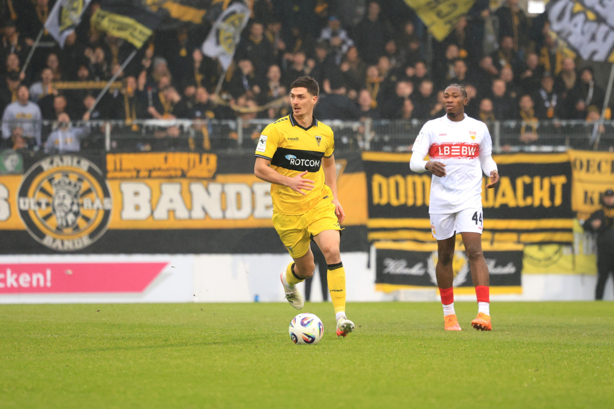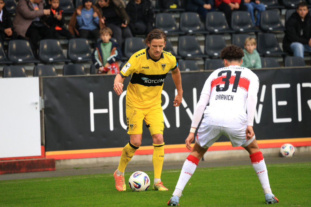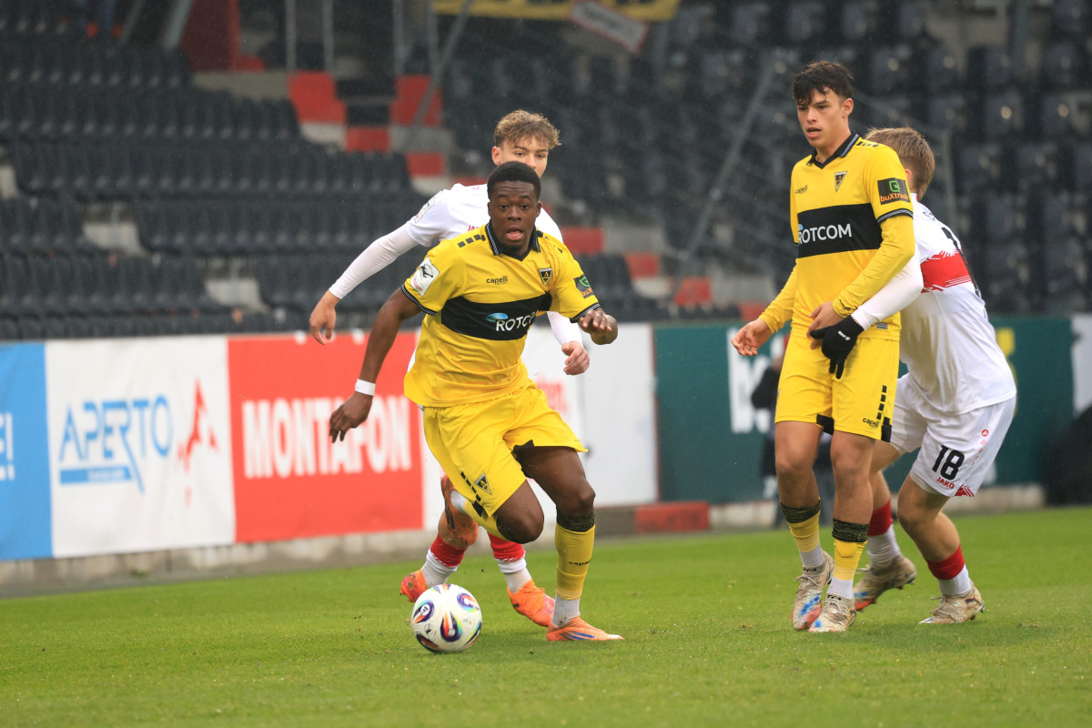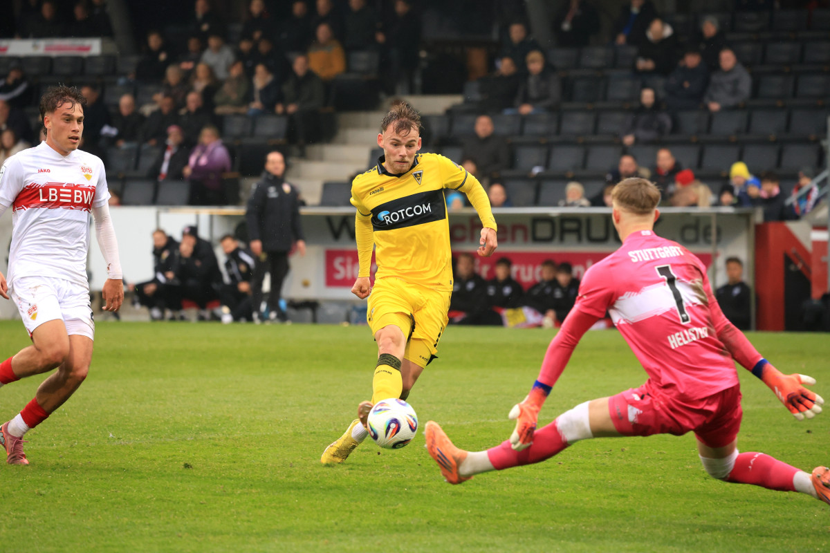 Und die Aachener Verteidigung hatte zu Beginn des Spiels ihre liebe Mühe, mit den jungen Stuttgartern zurechtzukommen. Immer wieder setzte der quirlige Noah Darvich den Aachener Abwehrspielern zu. So verpasste Mohamed Sankoh nach einer Darvich-Flanke nur knapp das Tor (7.). Eine Zeigerumdrehhung später war es wieder Darvich, der sich sowohl gegen Felix Meyer und Mika Schroers durchsetzte und aus spitzem Winkel schlussendlich nur knapp verzog (8.).