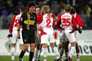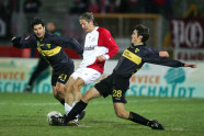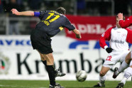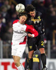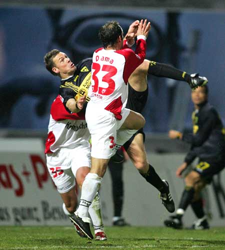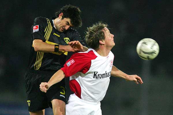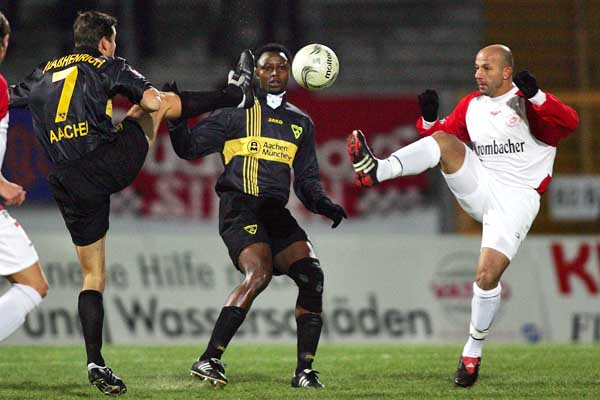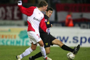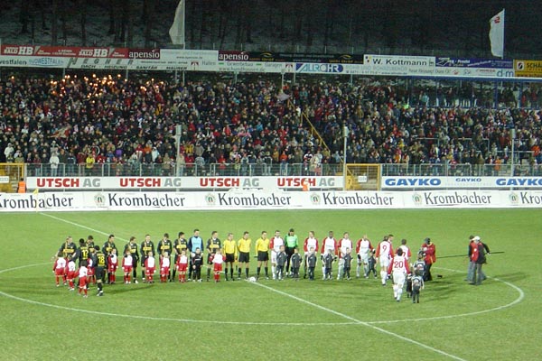 Ehe der Führungstreffer fiel, demonstrierte die Alemannia, wie man trotz schwerer Bodenverhältnisse gefällig kombinieren kann. Der Ball lief wie am Schnürchen durch die schwarz-gelben Reihen, zwangsläufig ergaben sich Torchancen. Nach 120 Sekunden setzte Sascha Rösler, der mit leicht blessierter Wade ins Spiel gegangen war, einen Kopfball über das Tor. Hüne Adnan Masic machte bei der Hereingabe keine glückliche Figur. Cristian Fiel tauchte nach sechs Minuten in ungewohnter Rolle auf. Er setzte einen Kopfball nach Reghecampf-Ecke an den Außenpfosten. Weiter ging’s im Takt: Wiederum Reghecampf flankte vors Tor, Meijer verpasste nur knapp.