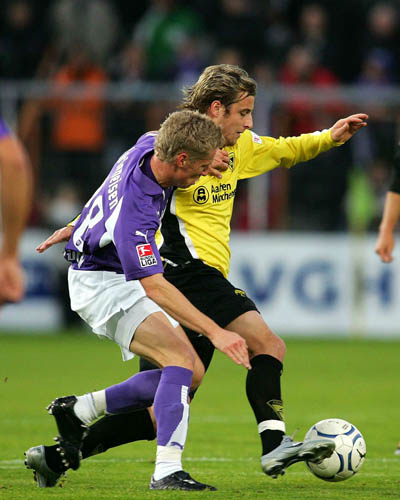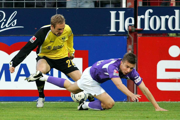 In der 13. Minute kam das erste Lebenszeichen von den sonst so heimstarken Osnabrückern. Da Alemannen-Keeper Stephan Straub aufgepasst hatte, erreichte er den Ball vor dem heranstürmenden Thomas Reichenberger. Ein paar Sekunden später hatte der Angreifer den Ausgleich dann auf dem Fuß. Er versuchte es aus ähnlicher Position wie Szilárd Nemeth, sein Ball ging jedoch knapp über den Querbalken. Der Gastgeber kam jetzt besser in die Partie und Gaetano Manno hatte die nächste gute Chance. Da der Italiener ein bisschen zu hoch gezielt hatte, blieb es bei der Führung der Aachener (18.). Diese hatte allerdings nur noch bis zur 23. Minute bestand: Die Flanke von Bilal Aziz landete genau auf dem Kopf von Paul Thomik, der Aachens Keeper keine Chance ließ - 1:1 (23.). Die Osnabrücker übernahmen in der Folgezeit das Kommando, aber der Abwehrverbund der Schwarz-Gelben hielt den Angriffen stand.
