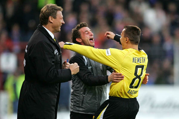 Stattdessen versuchte der Gastgeber das Spiel zu machen, die Alemannen passten jedoch gut auf. Auf einen Mann hatten die Aachener Abwehrspieler 15 Minuten vor dem Ende aber nicht aufgepasst: Szilárd Nemeth. Durch eine unglückliche Kopfballverlängerung traf der Torschütze des 1:0 diesmal ins eigene Tor. In der Schlussviertelstunde hatte der Gastgeber nun wieder etwas mehr Aufwind, hochkarätige Chancen spielten sie sich allerdings nicht mehr heraus. Vier Minuten vor dem Ende brachten die Schwarz-Gelben den VfL noch einmal ins Zittern, nachdem Laurentiu Reghecampf den Ball aus spitzem Winkel an Berbig vorbeigelegt. Zwei Osnabrücker behinderten sich im eigenen Fünfmeterraum gegenseitig, es sprang aber nur eine Ecke für die Alemannia heraus. Das war dann auch die letzte nennenswerte Aktion in der Partie gegen den heimstarken Aufsteiger, so dass am Ende ein Remis auf der Anzeigetafel zu sehen war.