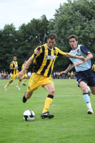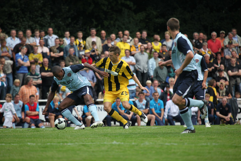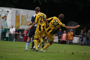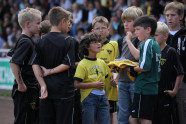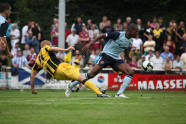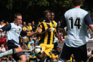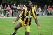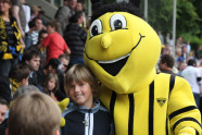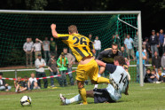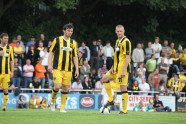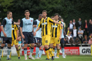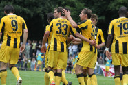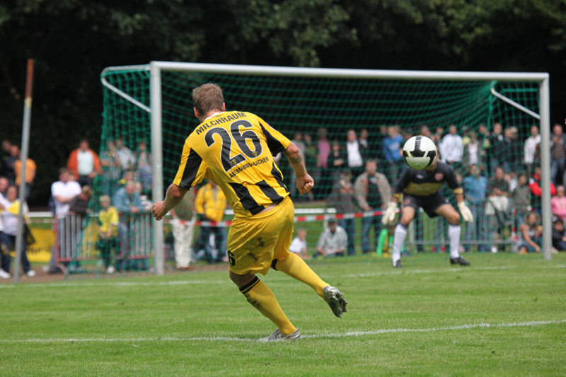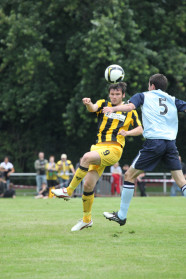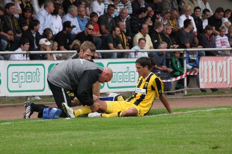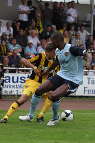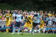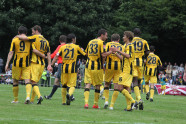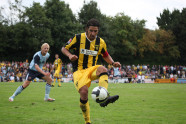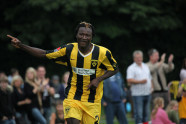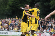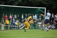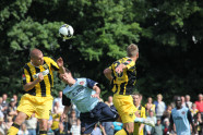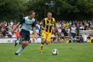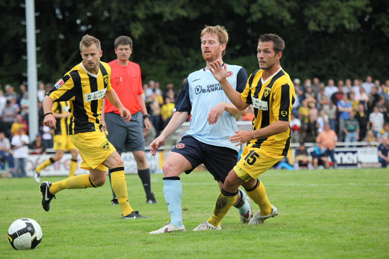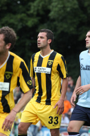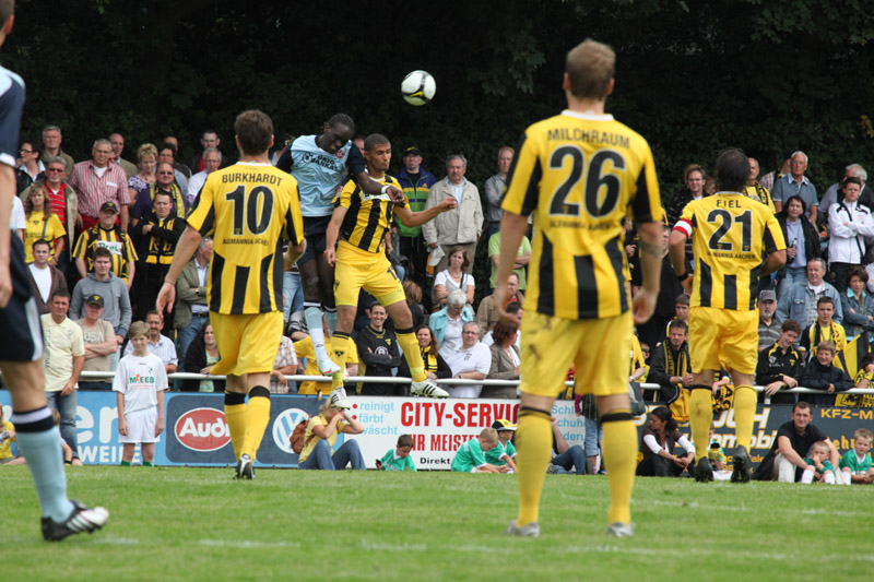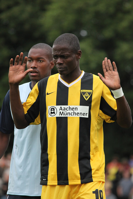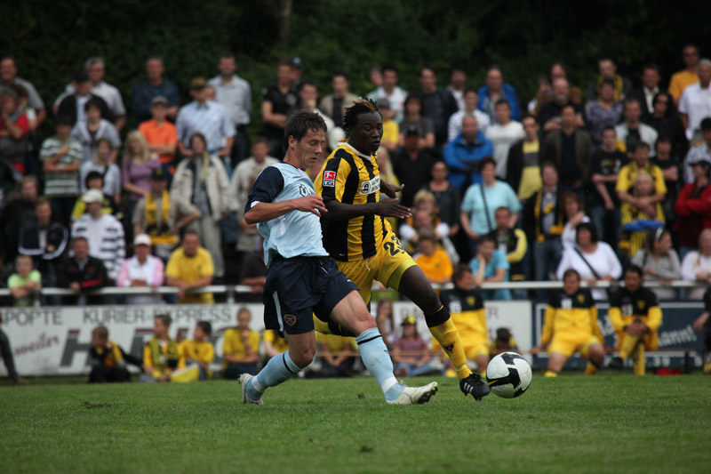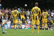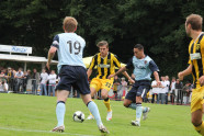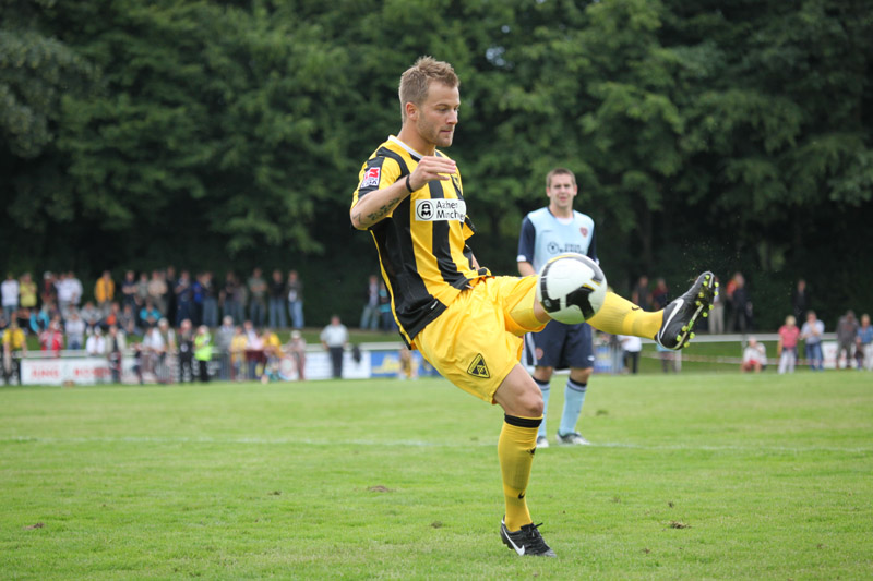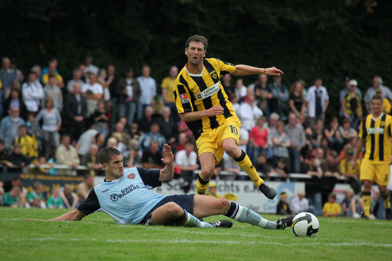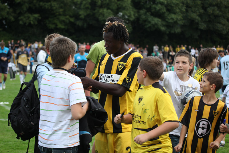 Fünf Minuten später durfte die Alemannia erstmals jubeln. Nach einer schönen Flanke von Florian Müller war es Abdul Özgen, der am höchsten stieg und per Kopf den 1:1-Ausgleich erzielte (25.). Bereits nach einer halben Stunde musste Trainer Seeberger verletzungsbedingt wechseln. Jérome Polenz hatte sich in einem Zweikampf am Knie verletzt und wurde durch Patrick Milchraum ersetzt (30.) Nach dem Ausgleich kam die Alemannia nun deutlich besser ins Spiel. So war es wieder Benny Auer , der sich nach einer Flanke von Florian Müller gegen die körperlich starken Innenverteidiger der Hearts durchsetzen konnte. Aachens Nummer 9 verfehlte nur knapp das gegnerische Tor. Nun machten die Schwarz-Gelben vor der Pause noch einmal richtig Druck und gingen noch in den ersten 45 Minuten in Führung. Als die Hearts den Ball im eigenen 16er nicht klären konnten, ließ sich Abdul Özgen nicht zweimal bitten und verwandelte sicher zum 2:1. Mit dem Ergebnis gingen beide Mannschaften dann auch in die Kabine.