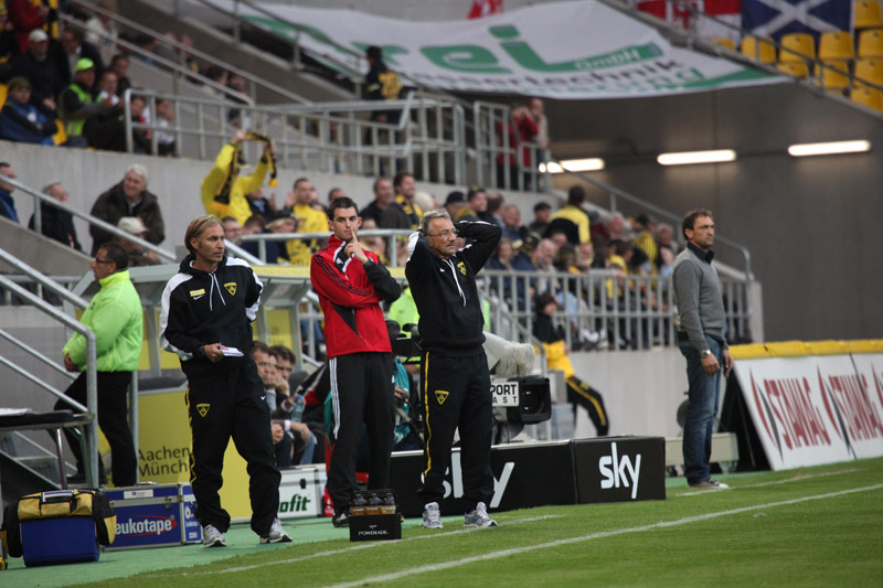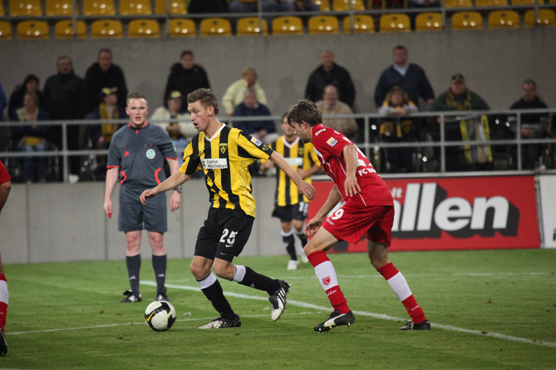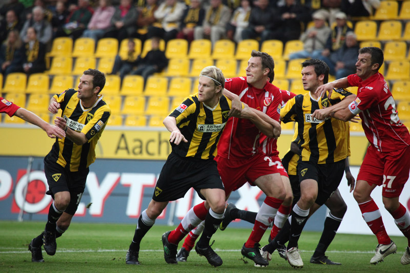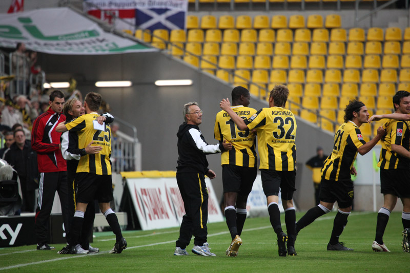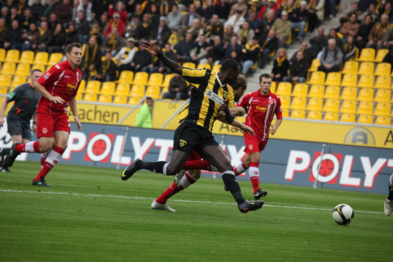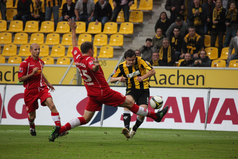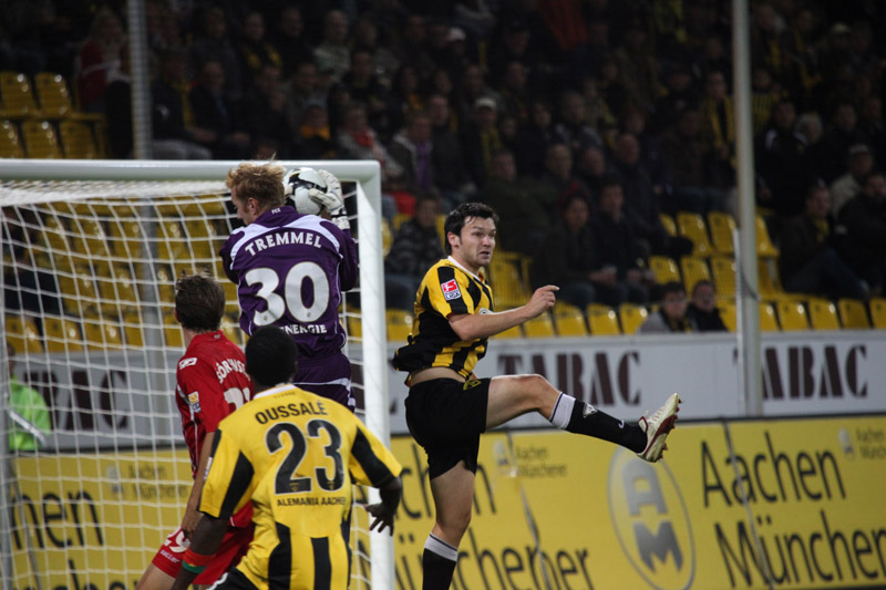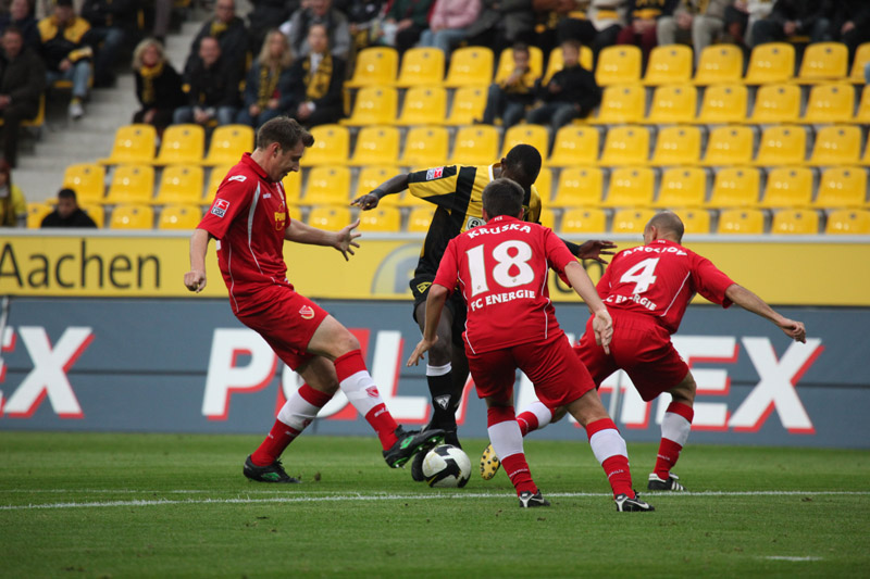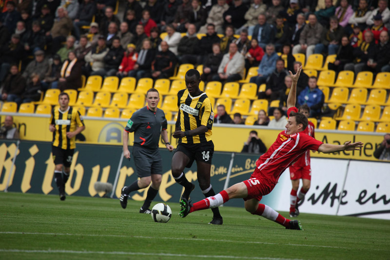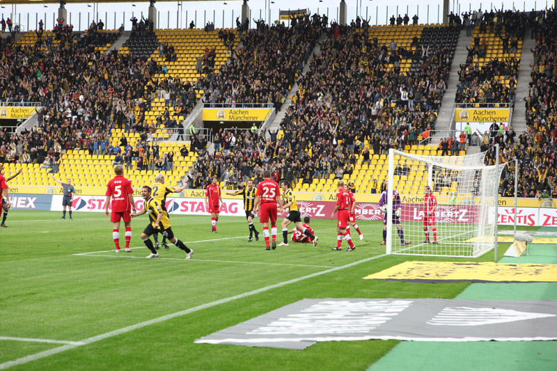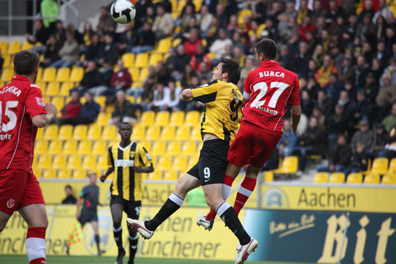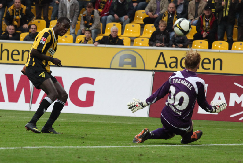 Das schwarz-gelbe Feuerwerk setzte sich auch in den weiteren Minuten fort, der agile Kratz prüfte Tremmel mit einem gefährlichen Fernschuss. Die daraus resultierende Ecke trat Timo Achenbach gefährlich in den Cottbusser Strafraum und da Benny Auer in der Mitte sträflich allein gelassen wurde, köpfte der Torschützenkönig seinen 5. Saisontreffer - 1:0. Durch druckvolles und zugleich konzentriertes Spiel gaben die Aachener den Rhythmus weiter vor, die Versuche des stark aufspielenden Burkhardt (16.) und Gueye (18.) blieben jedoch zu ungefährlich. In der 24. Minute sah das schon ganz anders aus: Cristian Fiel spielte Gueye mustergültig frei, der Senegalese scheiterte freistehend an Tremmel. 180 Sekunden später stand dieses Duell wieder im Mittelpunkt, Gueye verpasste es aber erneut, den zweiten Treffer nachzulegen.