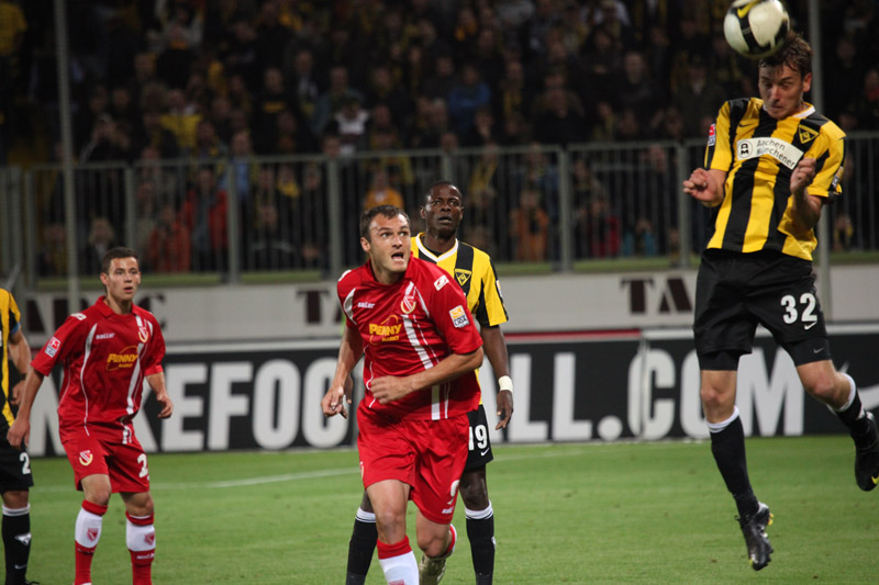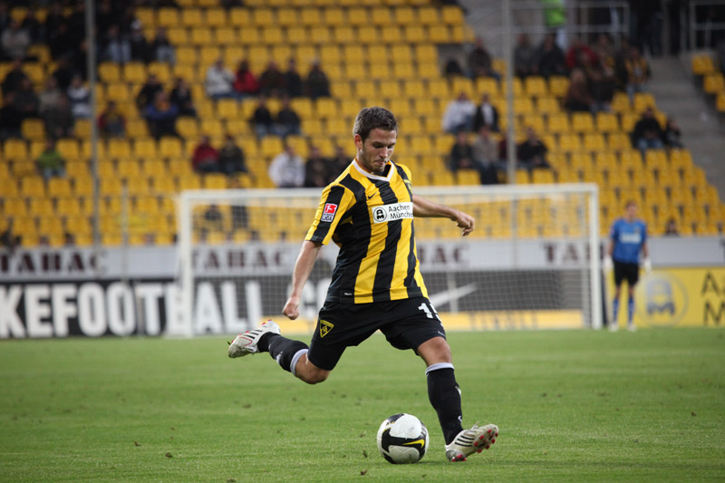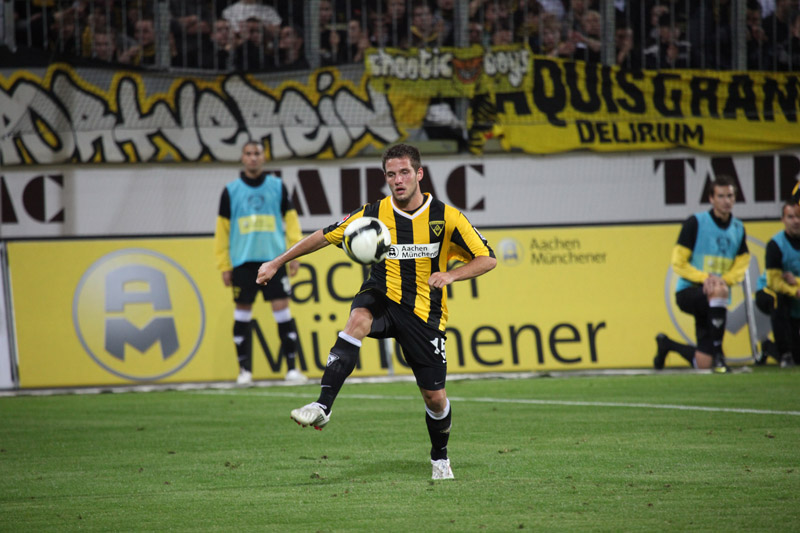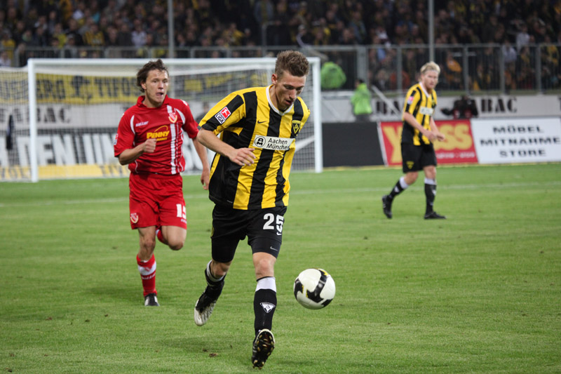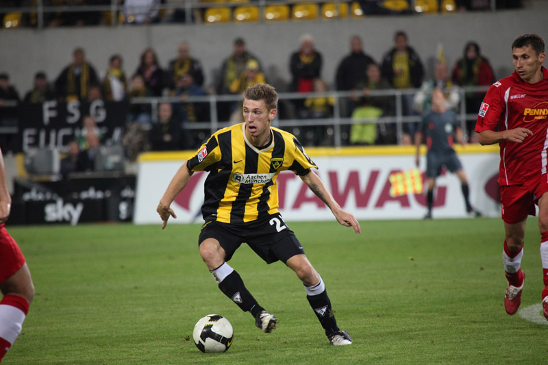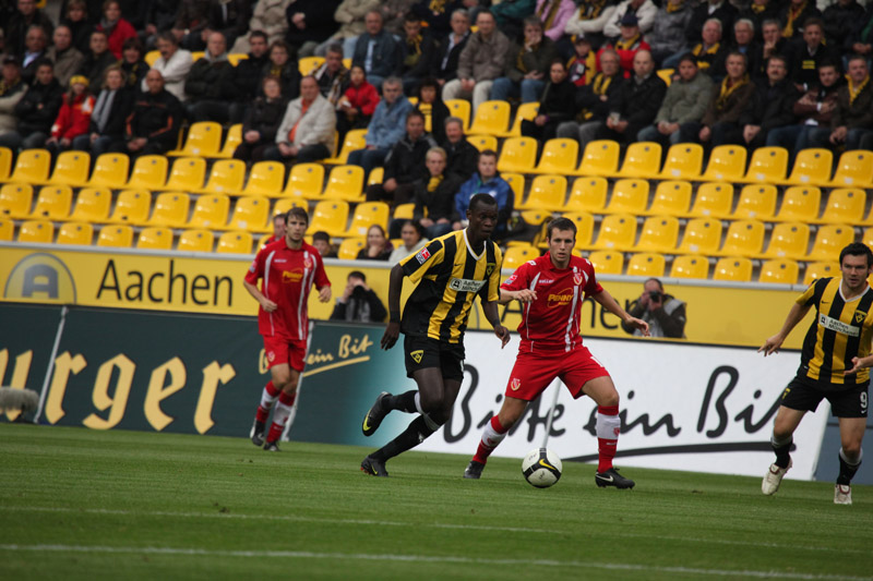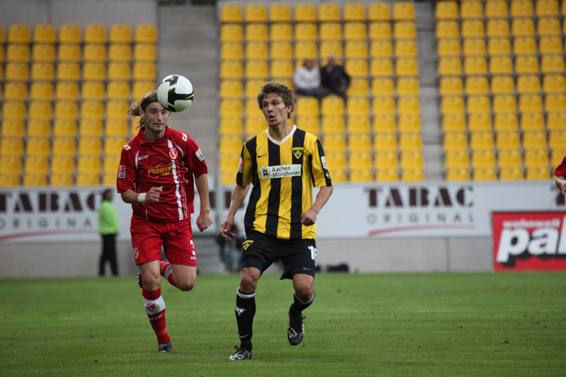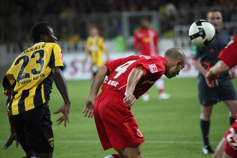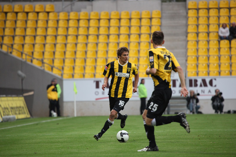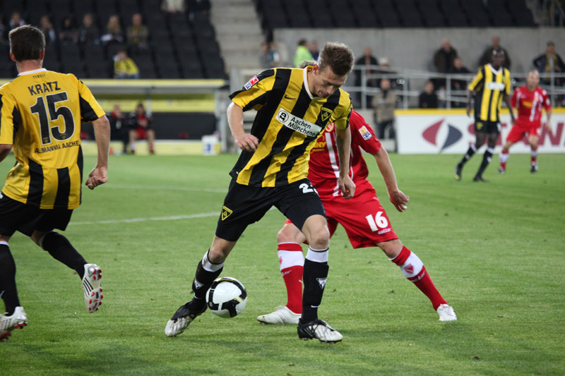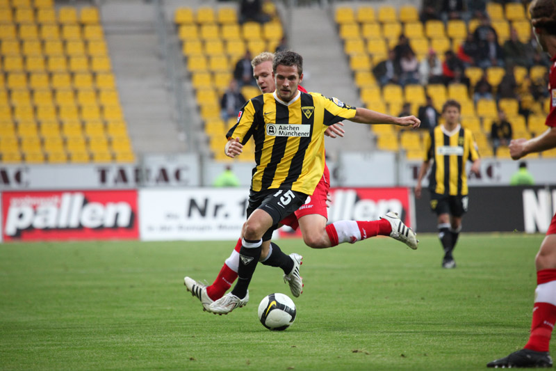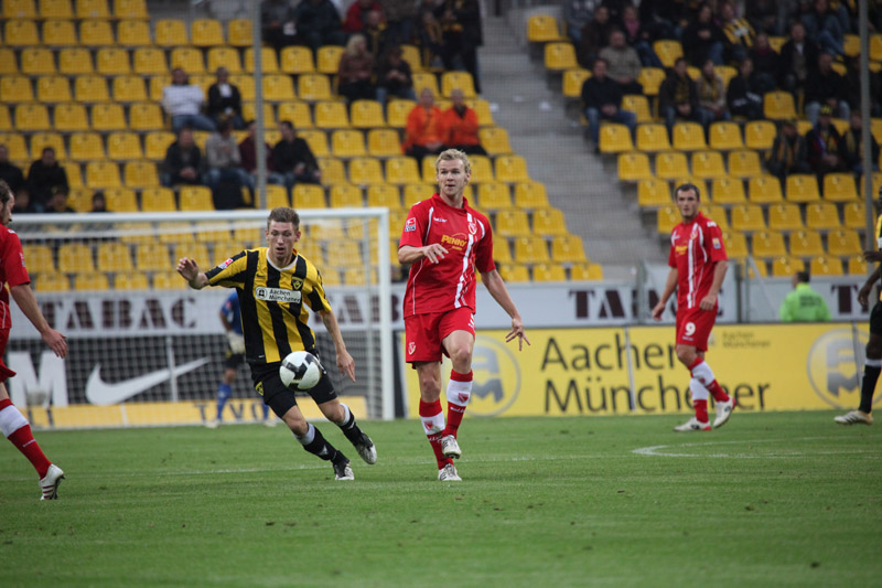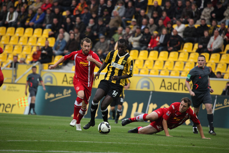 Das schwarz-gelbe Feuerwerk setzte sich auch in den weiteren Minuten fort, der agile Kratz prüfte Tremmel mit einem gefährlichen Fernschuss. Die daraus resultierende Ecke trat Timo Achenbach gefährlich in den Cottbusser Strafraum und da Benny Auer in der Mitte sträflich allein gelassen wurde, köpfte der Torschützenkönig seinen 5. Saisontreffer - 1:0. Durch druckvolles und zugleich konzentriertes Spiel gaben die Aachener den Rhythmus weiter vor, die Versuche des stark aufspielenden Burkhardt (16.) und Gueye (18.) blieben jedoch zu ungefährlich. In der 24. Minute sah das schon ganz anders aus: Cristian Fiel spielte Gueye mustergültig frei, der Senegalese scheiterte freistehend an Tremmel. 180 Sekunden später stand dieses Duell wieder im Mittelpunkt, Gueye verpasste es aber erneut, den zweiten Treffer nachzulegen.