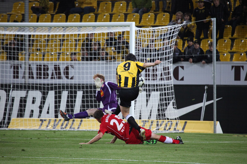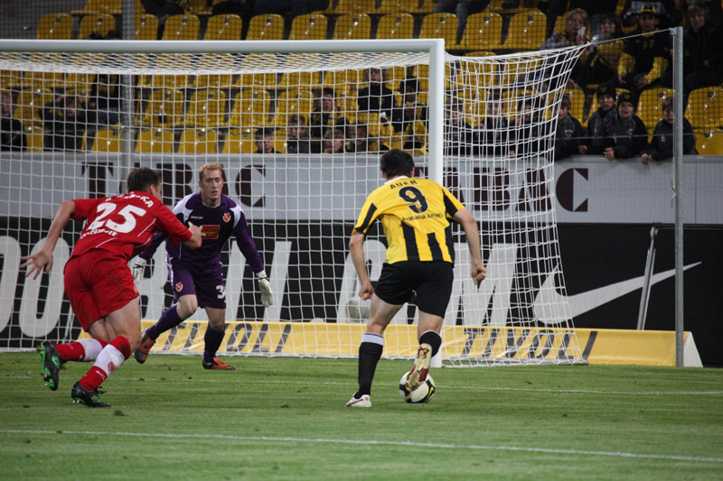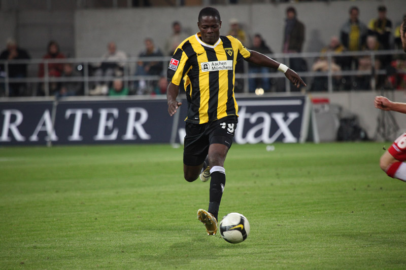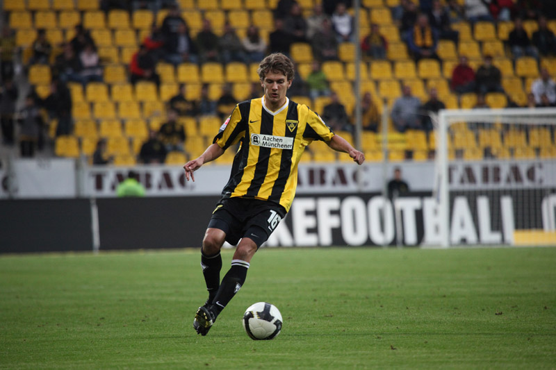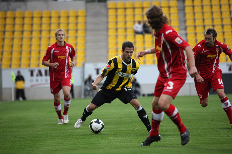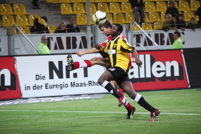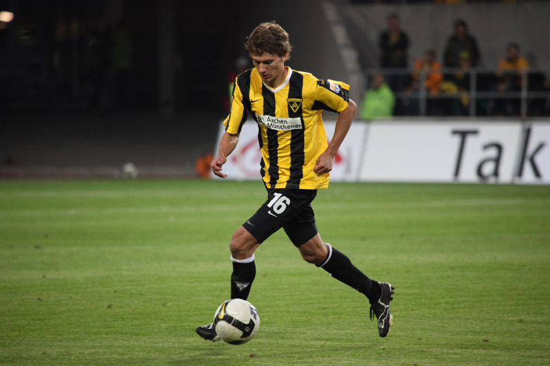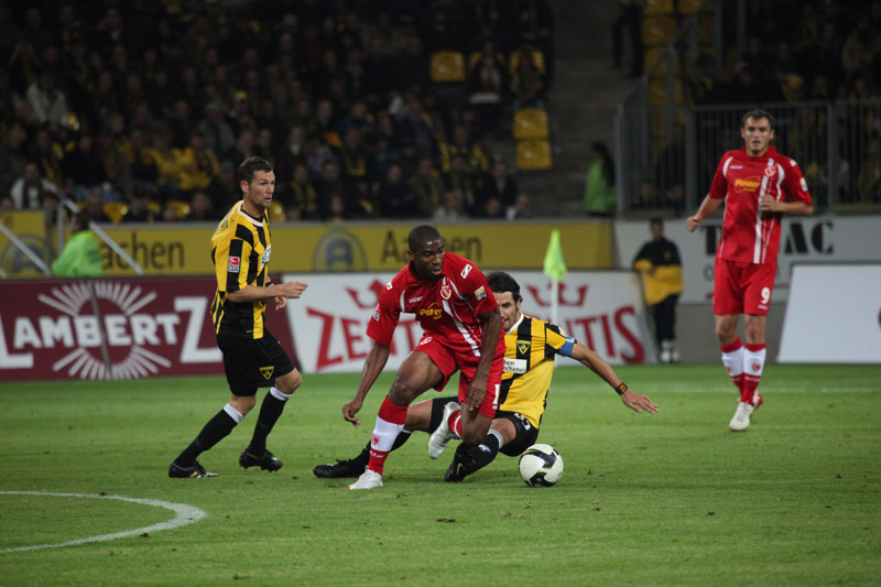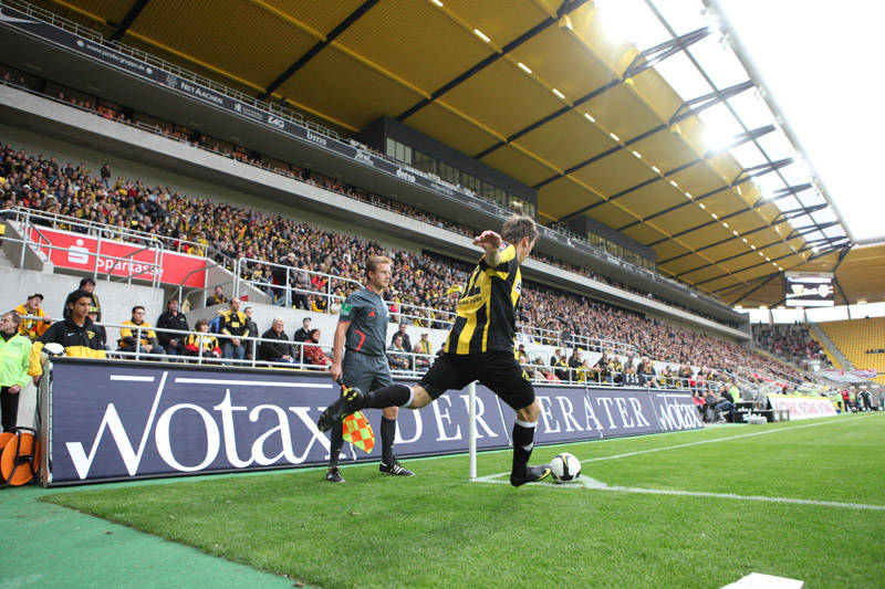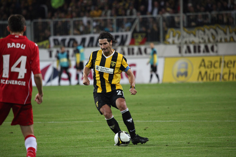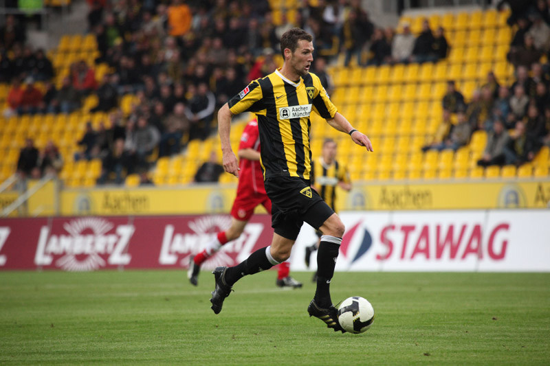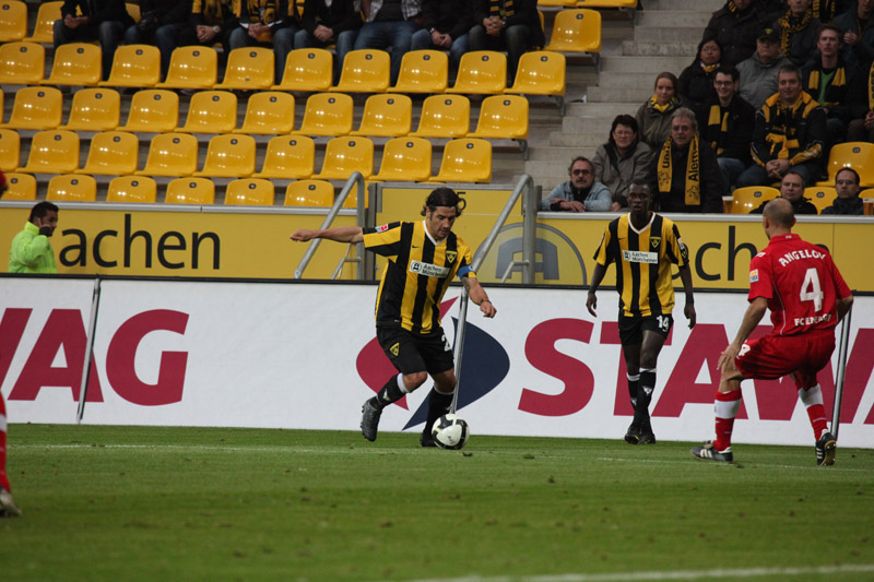 Das schwarz-gelbe Feuerwerk setzte sich auch in den weiteren Minuten fort, der agile Kratz prüfte Tremmel mit einem gefährlichen Fernschuss. Die daraus resultierende Ecke trat Timo Achenbach gefährlich in den Cottbusser Strafraum und da Benny Auer in der Mitte sträflich allein gelassen wurde, köpfte der Torschützenkönig seinen 5. Saisontreffer - 1:0. Durch druckvolles und zugleich konzentriertes Spiel gaben die Aachener den Rhythmus weiter vor, die Versuche des stark aufspielenden Burkhardt (16.) und Gueye (18.) blieben jedoch zu ungefährlich. In der 24. Minute sah das schon ganz anders aus: Cristian Fiel spielte Gueye mustergültig frei, der Senegalese scheiterte freistehend an Tremmel. 180 Sekunden später stand dieses Duell wieder im Mittelpunkt, Gueye verpasste es aber erneut, den zweiten Treffer nachzulegen.