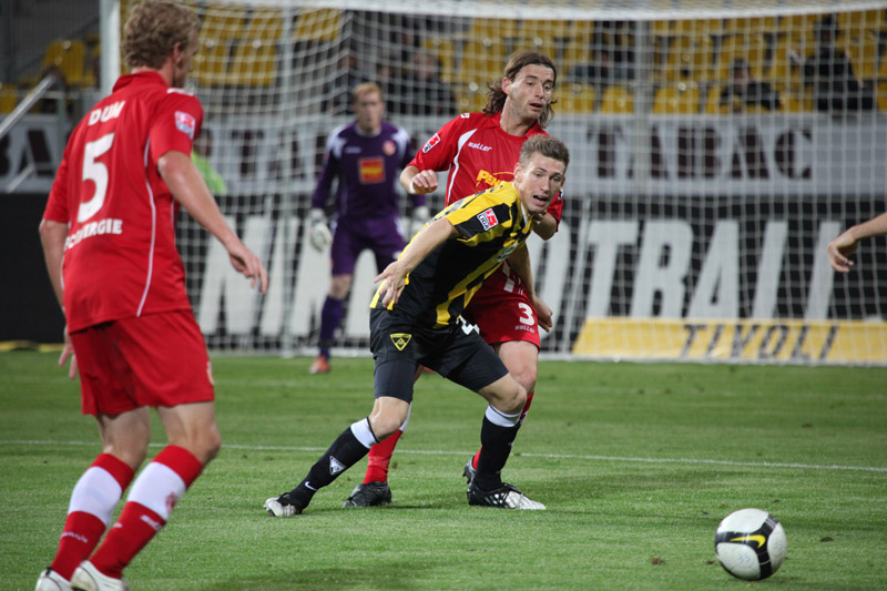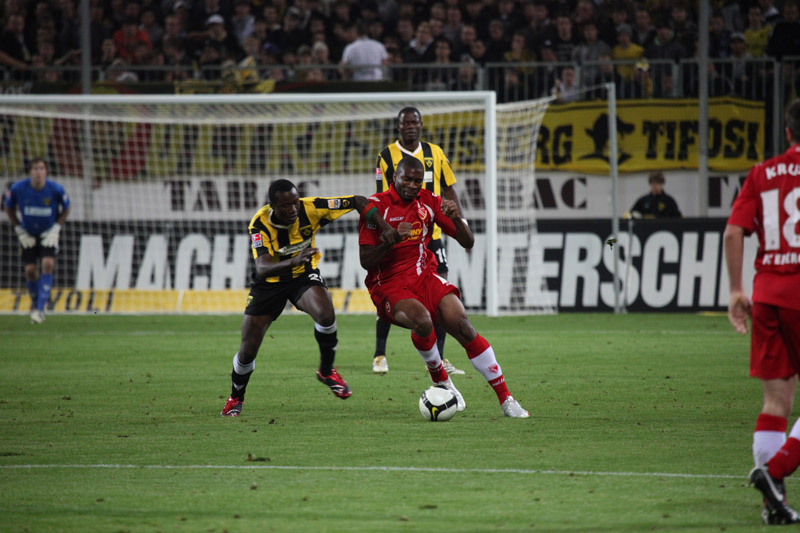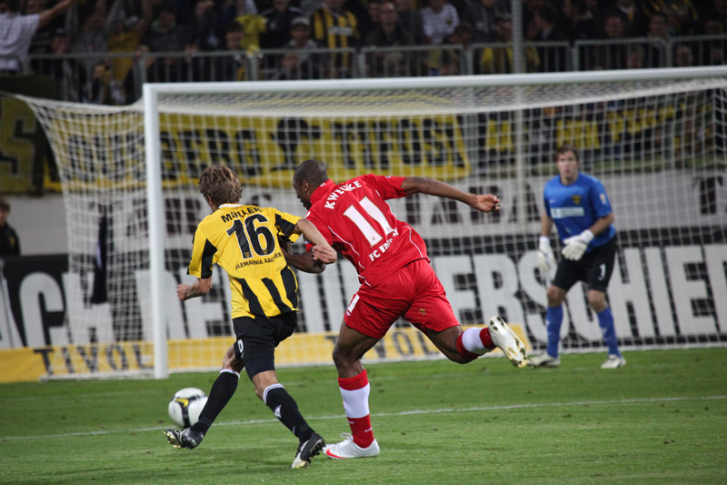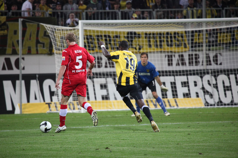 Auch nach dem Seitenwechsel ließen die Schwarz-Gelben Ball und Gegner geschickt laufen. Die großen Offensivhighlights der ersten Hälfte - unglaubliche 17 Schüsse feuerten die Aachener ab - stellten sich vorerst aber nicht ein. Cottbus lauerte auf Konter, in der 54. Minute fanden die Energie-Akteure eine der wenigen Lücken: Der Ex-Alemanne Sascha Dum spitzelte Olajengbesi das Leder weg, bei seinem Schuss war Stuckmann zur Stelle. Die Krüger-Elf kombinierte sich immer wieder sicher durch das Mittelfeld. Was fehlte, war lediglich der zweite Treffer, den Benny Auer nach seinem Pfostenknaller knapp verpasste (58.).