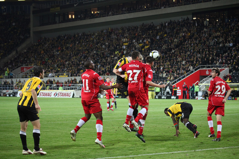 In der Folgezeit segelte eine Ecke nach der nächsten in den Energie-Sechzehner, nach 69 Minuten stand ein klares 10:0-Eckenverhältnis zu Buche. Die Alemannen drückten unentwegt auf die Entscheidung, aber weder der Versuch von Fiel (70.), noch die Direktabnahme von Junglas (71.) brachten die Erlösung. Und so kam es, wie es kommen musste: Mit dem vierten Energie-Torschuss erzielte der eingewechselte Clemens Fandrich den Ausgleich (80.). In den letzen zehn Minuten mobilisierten die Schwarz-Gelben noch einmal alle Kräfte, die Cottbusser ließen aber keine weiteren Chancen mehr zu, so dass die Partie mit einer unglücklichen Punkteteilung endete.