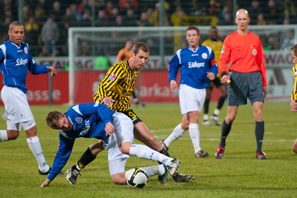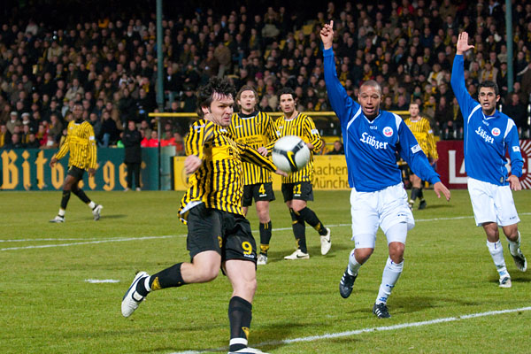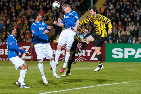 Auf dem saftigen, neuen Grün suchten beide Mannschaften in den ersten Minuten ihr Heil in der Offensive. Überraschenderweise sollte jedoch eine Kontersituation die erste Chance des Spiels bringen: Finn Bartels hatte Mario Fillinger frei gespielt. Der Mittelfeldspieler hatte sich den Ball aber zu weit vorgelegt, so dass Keeper Thorsten Stuckmann ihn parieren konnte. Im Nachschuss schoss Hansa Kapitän Martin Retov dann über den Aachener Kasten (3.). Durch einen ruhenden Ball kamen auch die Schwarz-Gelben zu ihrer ersten guten Möglichkeit: Der Freistoß von Timo Achenbach fand den Kopf von Hrvoje Vukovic, das Leder flog aber über das Gästetor (7.).