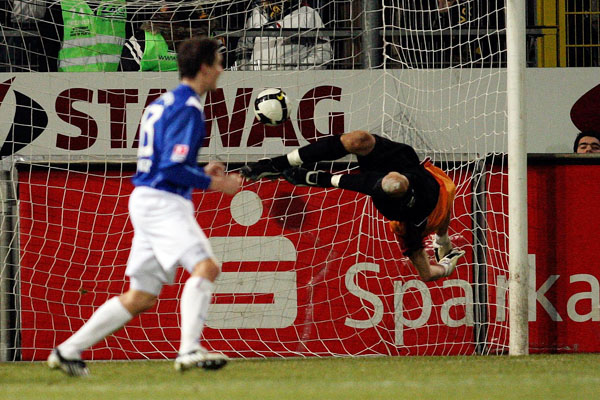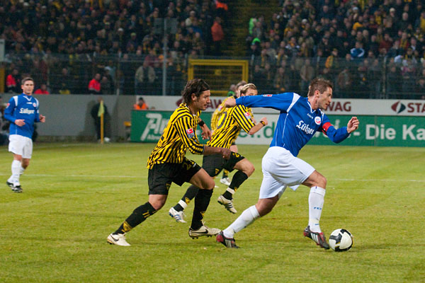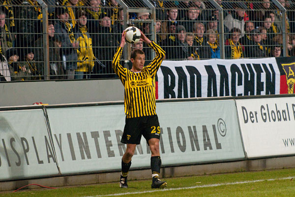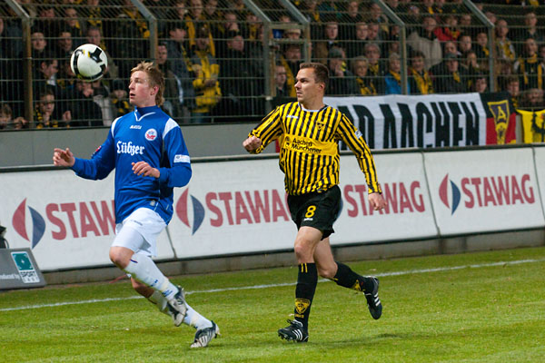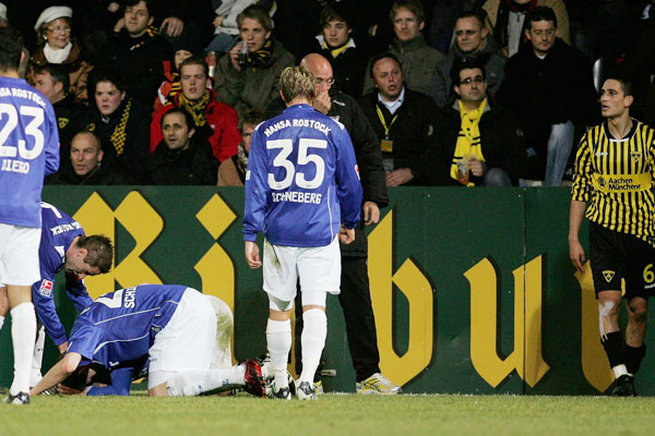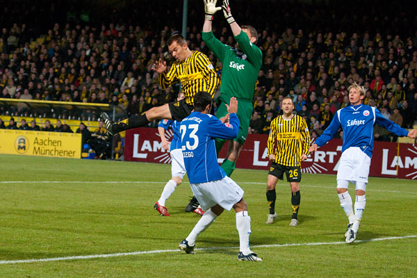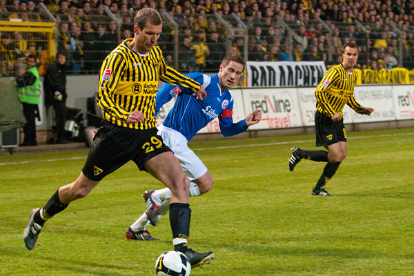 Von der Verunsicherung der letzten Wochen war bei den Rostockern nur wenig zu spüren. Immer wieder suchten sie den Weg nach vorne und immer wieder stand Martin Retov im Mittelpunkt. So auch in der 16. Minute: Im Duell der Kapitäne konnte Matthias Lehmann im letzten Moment den Schuss des Dänen blocken. Im direkten Gegenzug prüfte Patrick Milchraum mit einem knallharten Schuss Hansa-Keeper Hahnel, der den Ball mit beiden Fäusten zur Ecke ableiten musste (17.). In der 25. Minute hatten die Aachener Zuschauer erneut den Torschrei auf den Lippen, als Rostocks Abwehr nach einem Achenbach-Freistoß Szilárd Nemeth im Rücken übersehen hatte. Der Slowake köpfte jedoch genau in die Arme von Hahnel.