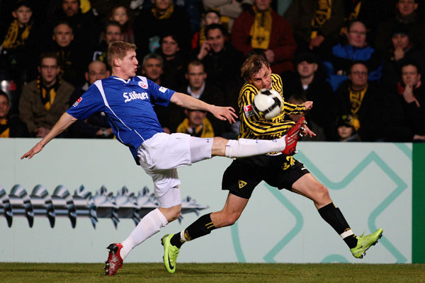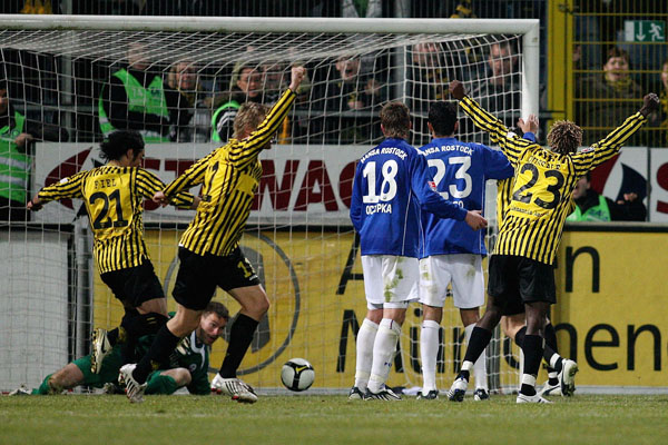 Trotz Unterzahl legten die Schwarz-Gelben in der zweiten Hälfte immer wieder den Vorwärtsgang ein. Dadurch boten sich den Rostockern Räume, fünf Minuten nach Wiederanpfiff bestrafte Finn Bartels die aufgerückte Aachener Hintermannschaft mit dem 0:2. Ein Mann weniger, zwei Tore Rückstand - wer dachte, die Seeberger-Elf würde sich geschlagen geben, sah sich getäuscht. Sekunden nach dem zweiten Gegentreffer brachte der eingewechselte Daun den Ball auf den zweiten Pfosten, wo Benny Auer lauerte und per Kopf den Anschlusstreffer markierte. Mitte der zweiten Hälfte versuchten die Hanseaten den alten Abstand wieder herzustellen: Der Freistoß von Bastian Oczipka, der nur den Pfosten traf (65.), stellte nur eine der vielen Möglichkeiten dar.