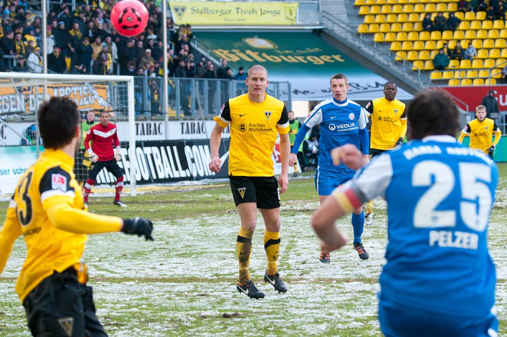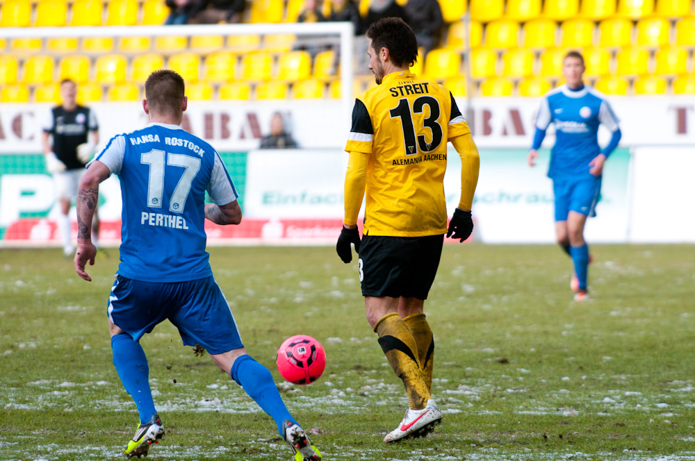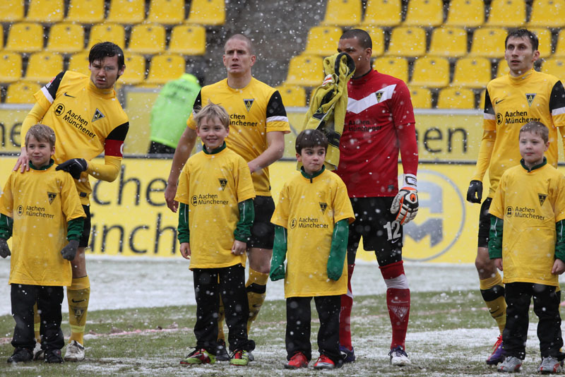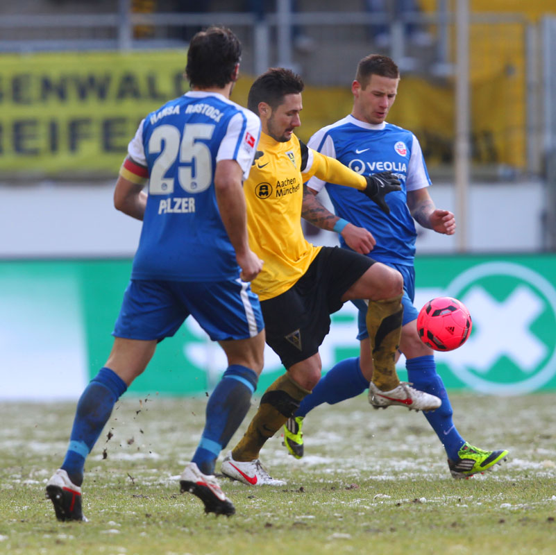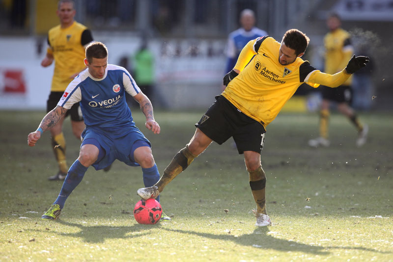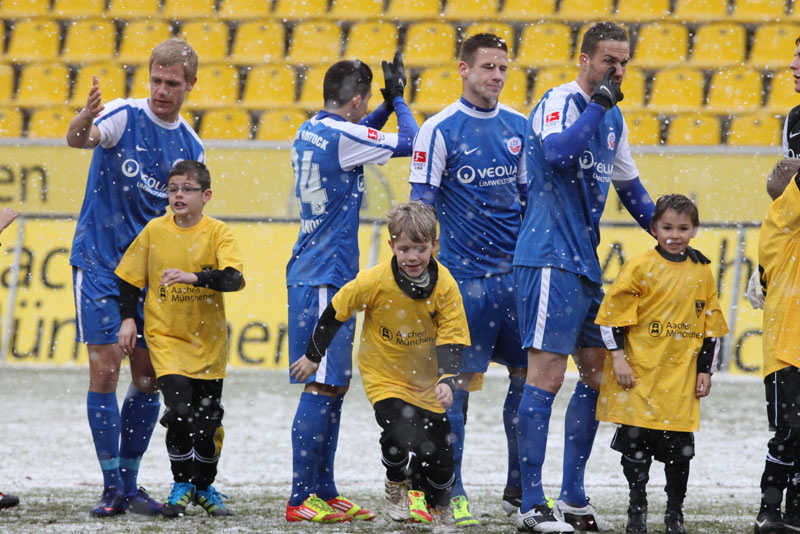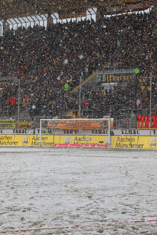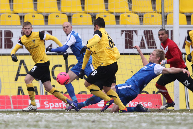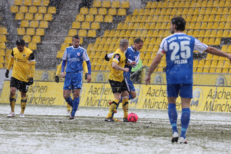 Die erfreulichste Nachricht am Ende war, dass sich niemand verletzt hat. Die Alemannia und der FC Hansa Rostock trennten sich am Karnevalssonntag mit 0:0. Dass die Partie überhaupt stattfand, stand lange auf der Kippe. Wegen des heftigen Schneefalls vor dem Spiel waren sich die Verantwortlichen beider Teams einig, auf dem seifigen Untergrund nicht aufzulaufen. Nach 40 Minuten Verzögerung entschied sich das Schiedsrichterteam dazu, die Partie auszutragen. 90 Minuten lang war es ein Glücksspiel, in dem Torchancen Mangelware waren. Ein Foul an Benny Auer im Strafraum war der größte Aufreger, da Schiedsrichter Wingenbach einen klaren Strafstoß nicht gab. Unter dem Strich war für beide Mannschaften kaum mehr möglich als das gerechte 0:0.