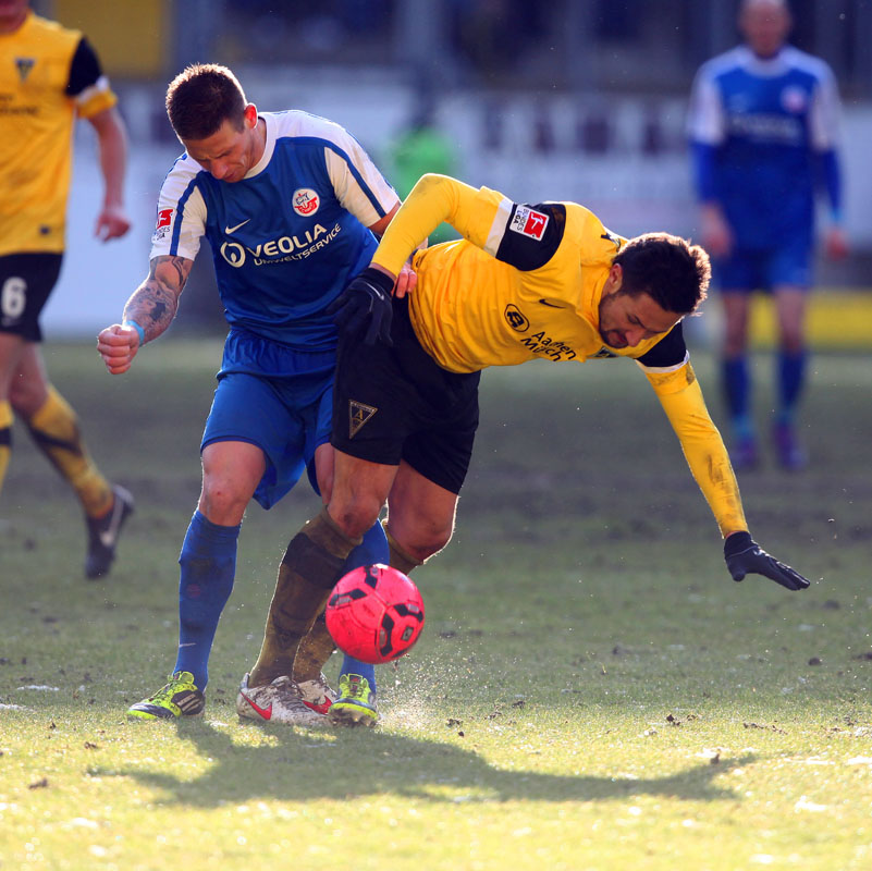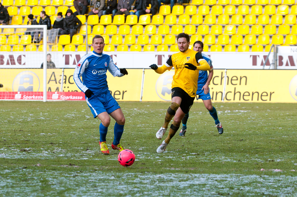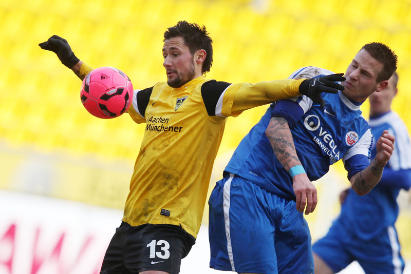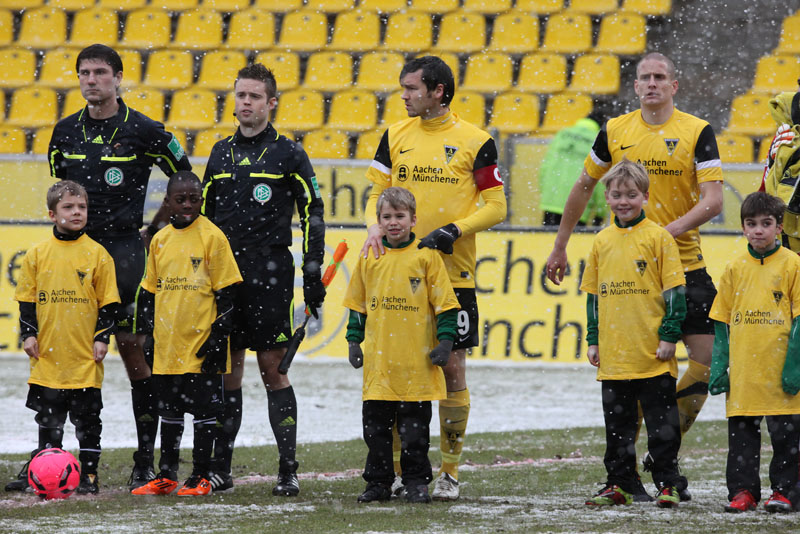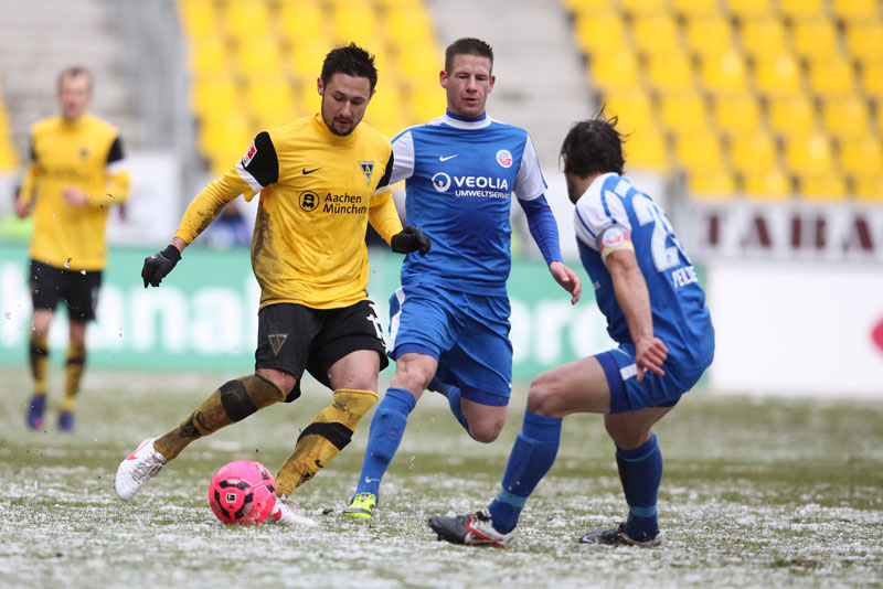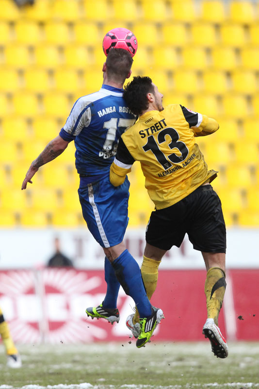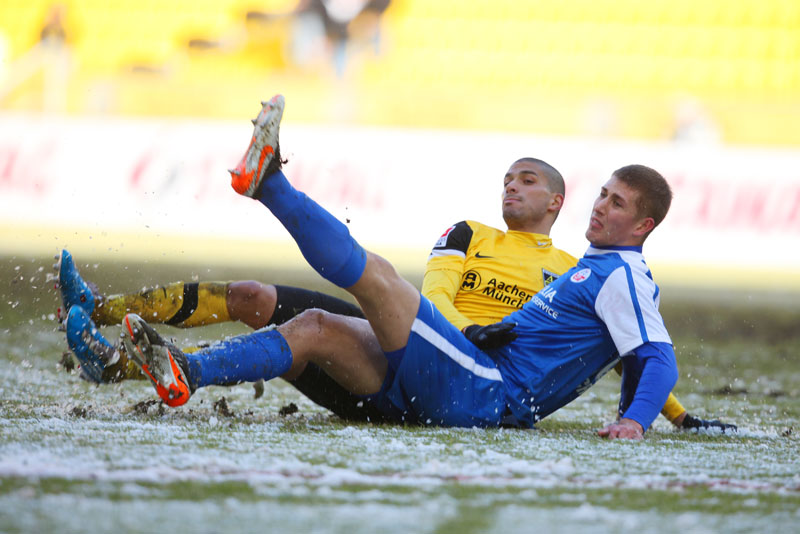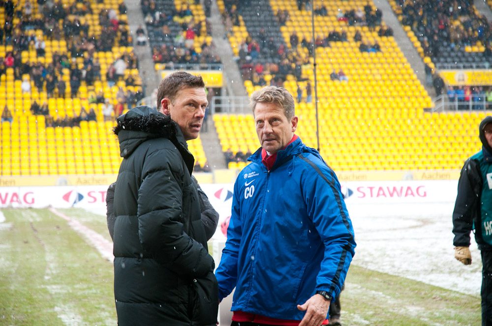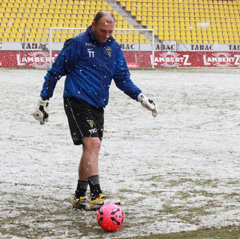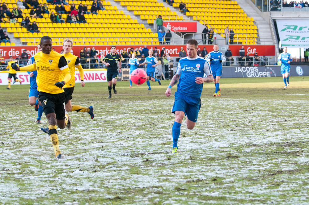 Die erfreulichste Nachricht am Ende war, dass sich niemand verletzt hat. Die Alemannia und der FC Hansa Rostock trennten sich am Karnevalssonntag mit 0:0. Dass die Partie überhaupt stattfand, stand lange auf der Kippe. Wegen des heftigen Schneefalls vor dem Spiel waren sich die Verantwortlichen beider Teams einig, auf dem seifigen Untergrund nicht aufzulaufen. Nach 40 Minuten Verzögerung entschied sich das Schiedsrichterteam dazu, die Partie auszutragen. 90 Minuten lang war es ein Glücksspiel, in dem Torchancen Mangelware waren. Ein Foul an Benny Auer im Strafraum war der größte Aufreger, da Schiedsrichter Wingenbach einen klaren Strafstoß nicht gab. Unter dem Strich war für beide Mannschaften kaum mehr möglich als das gerechte 0:0.
