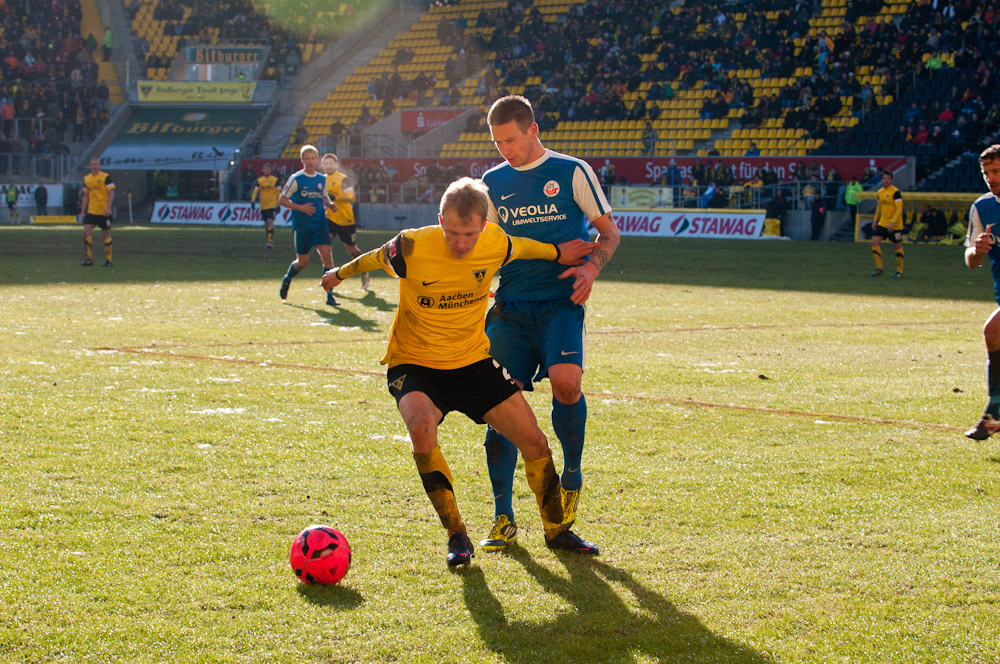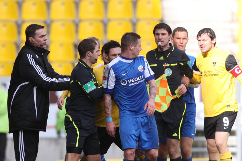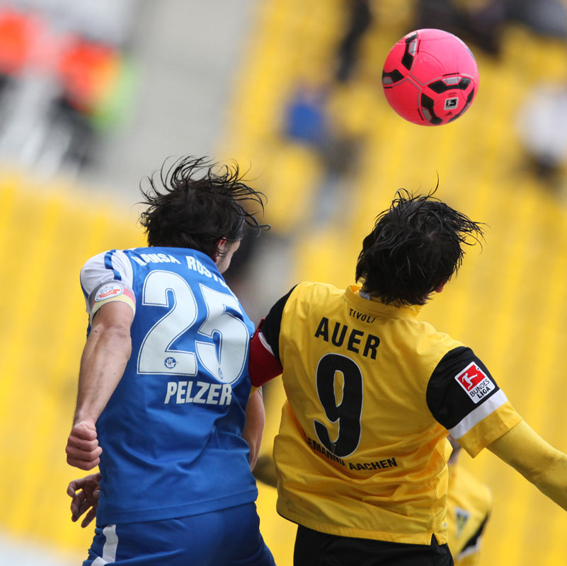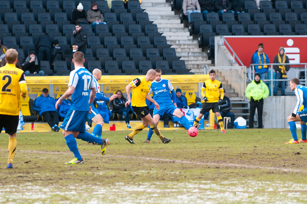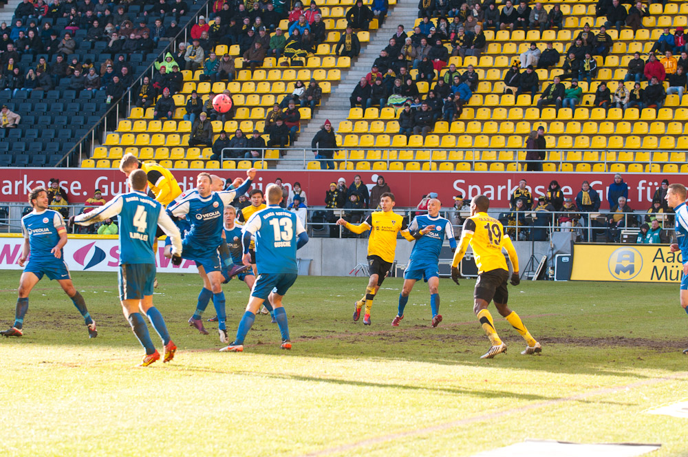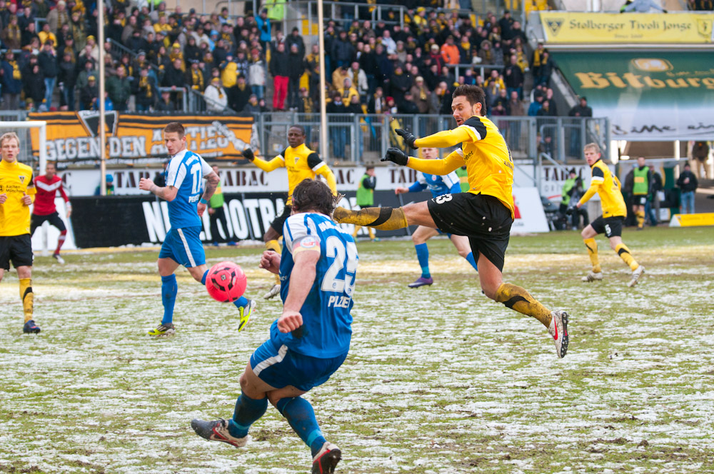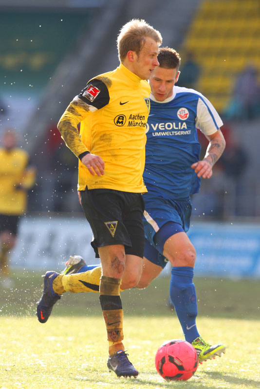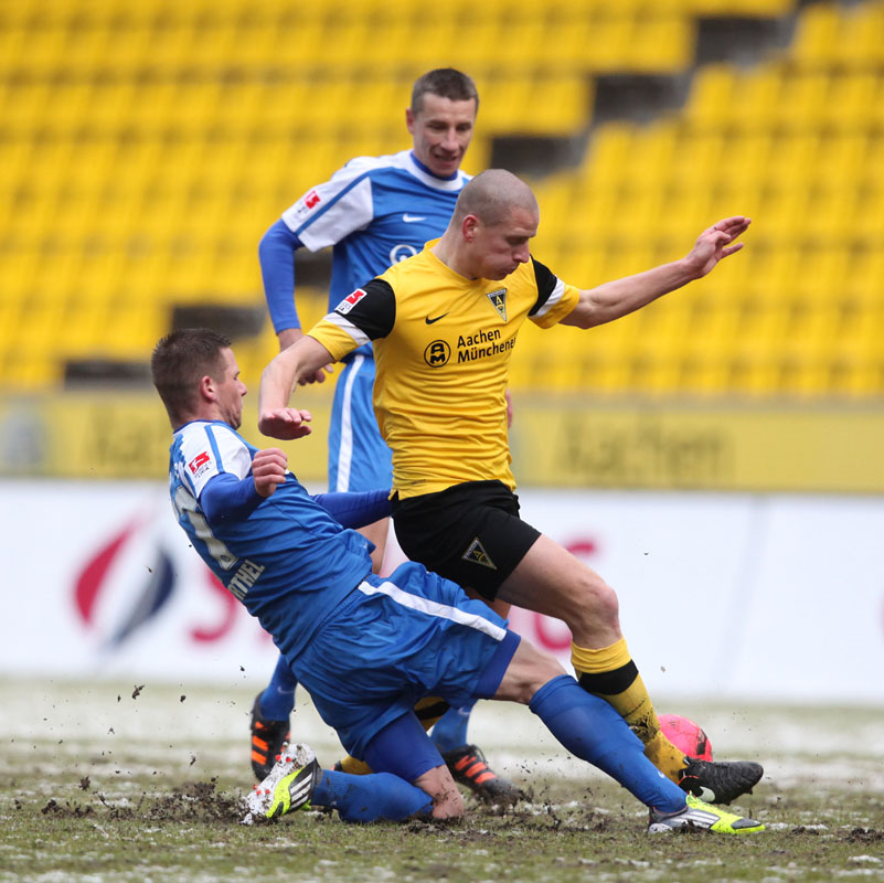 Die erfreulichste Nachricht am Ende war, dass sich niemand verletzt hat. Die Alemannia und der FC Hansa Rostock trennten sich am Karnevalssonntag mit 0:0. Dass die Partie überhaupt stattfand, stand lange auf der Kippe. Wegen des heftigen Schneefalls vor dem Spiel waren sich die Verantwortlichen beider Teams einig, auf dem seifigen Untergrund nicht aufzulaufen. Nach 40 Minuten Verzögerung entschied sich das Schiedsrichterteam dazu, die Partie auszutragen. 90 Minuten lang war es ein Glücksspiel, in dem Torchancen Mangelware waren. Ein Foul an Benny Auer im Strafraum war der größte Aufreger, da Schiedsrichter Wingenbach einen klaren Strafstoß nicht gab. Unter dem Strich war für beide Mannschaften kaum mehr möglich als das gerechte 0:0.