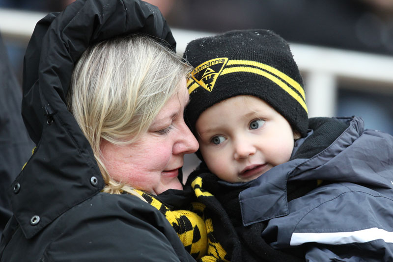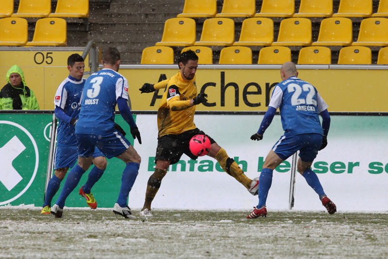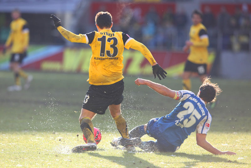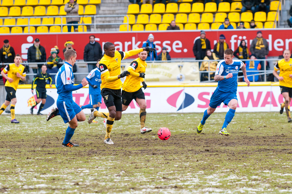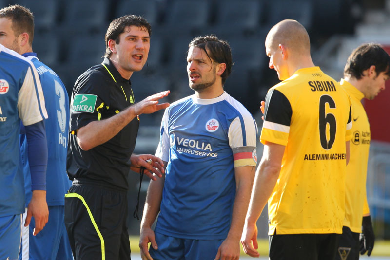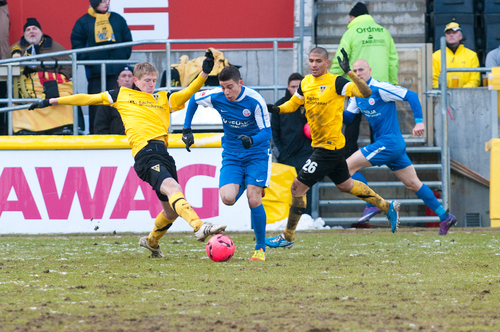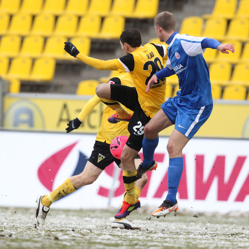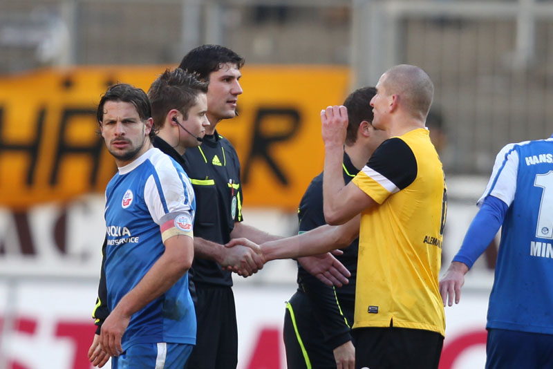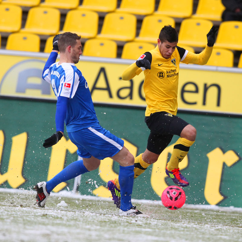 Die erfreulichste Nachricht am Ende war, dass sich niemand verletzt hat. Die Alemannia und der FC Hansa Rostock trennten sich am Karnevalssonntag mit 0:0. Dass die Partie überhaupt stattfand, stand lange auf der Kippe. Wegen des heftigen Schneefalls vor dem Spiel waren sich die Verantwortlichen beider Teams einig, auf dem seifigen Untergrund nicht aufzulaufen. Nach 40 Minuten Verzögerung entschied sich das Schiedsrichterteam dazu, die Partie auszutragen. 90 Minuten lang war es ein Glücksspiel, in dem Torchancen Mangelware waren. Ein Foul an Benny Auer im Strafraum war der größte Aufreger, da Schiedsrichter Wingenbach einen klaren Strafstoß nicht gab. Unter dem Strich war für beide Mannschaften kaum mehr möglich als das gerechte 0:0.