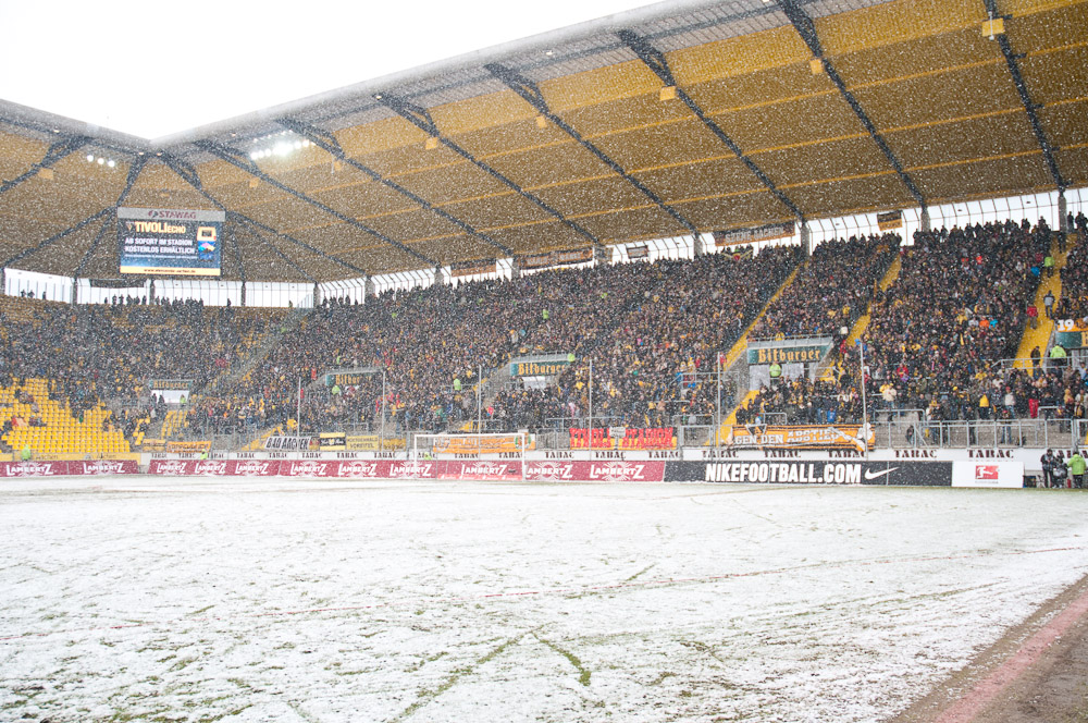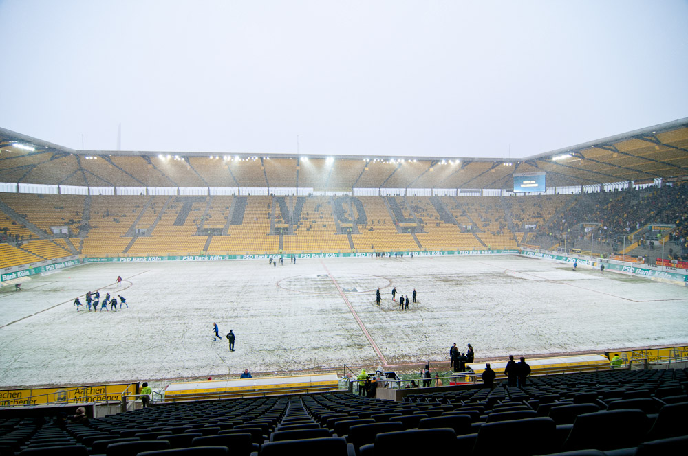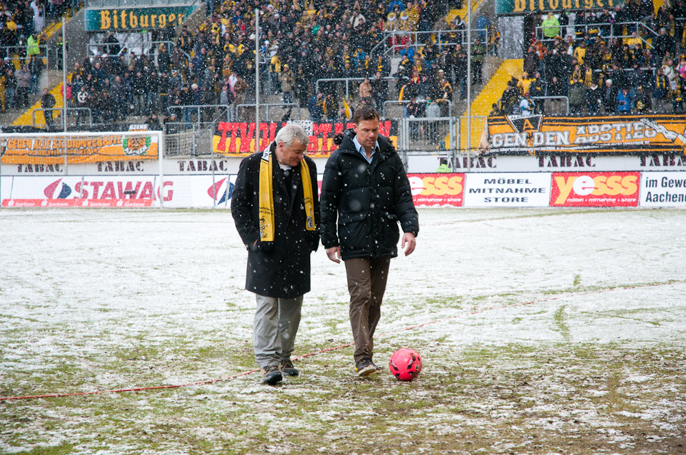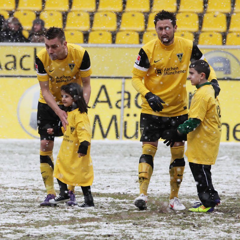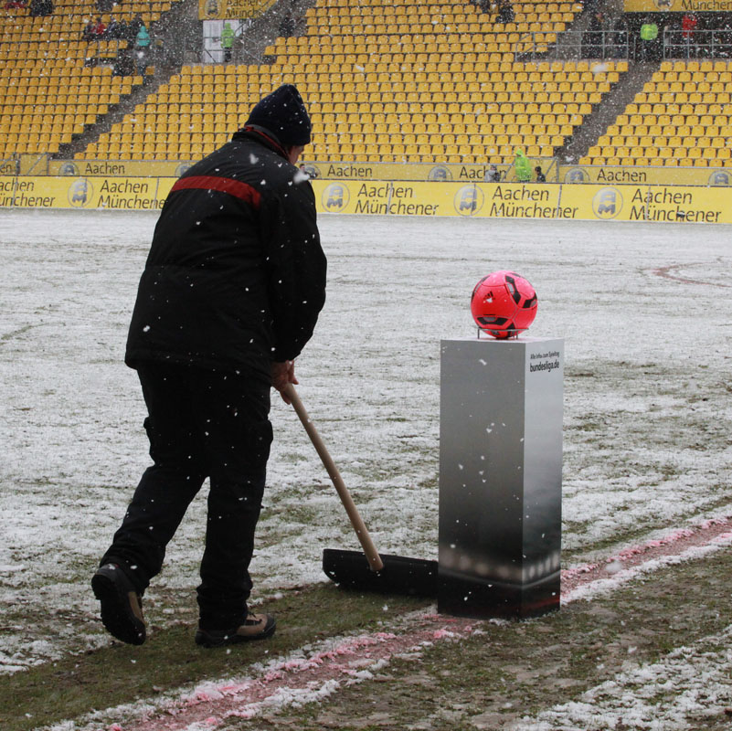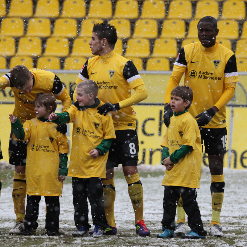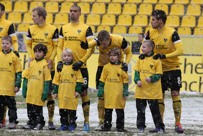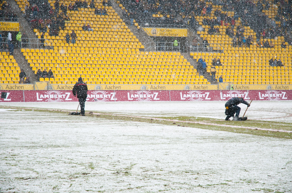 Das Wetter rund um den Tivoli war alles andere als karnevalsfreundlich. Doch damit nicht genug: Auch der Platz litt trotz seit zwei Tagen laufender Rasenheizung deutlich unter dem heftigen Schneefall. Die Verantwortlichen beider Teams verwiesen auf die irregulären Bedingungen und wollten nicht spielen, das Schiedsrichterteam pfiff die Partie trotzdem an. Um 14:10 Uhr war es dann soweit: Der Ball rollte – zumindest ansatzweise. Denn entweder blieb die Kugel auf dem seifigen Untergrund auf halber Strecke liegen, oder sie wurde plötzlich unerreichbar. Kombinationsfußball war zumindest kaum möglich, lange Bälle waren das Mittel auf beiden Seiten.
