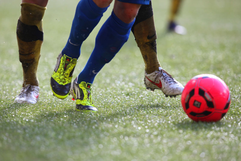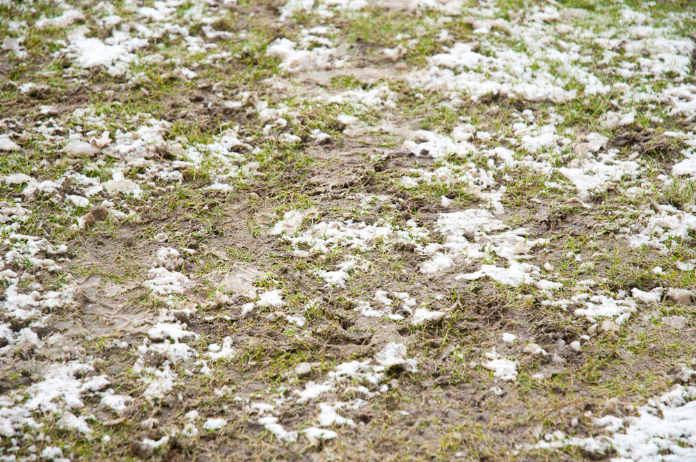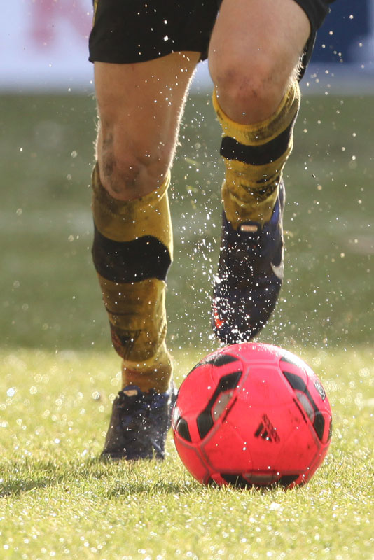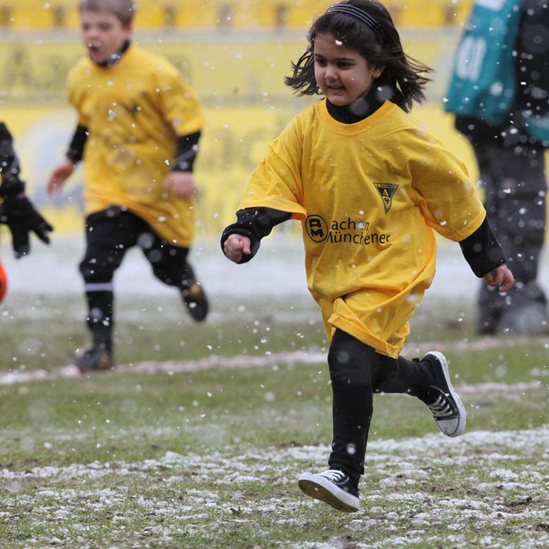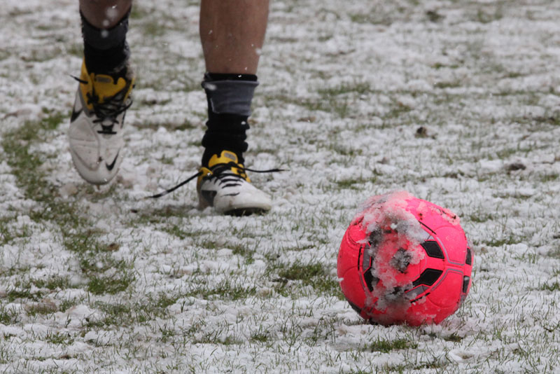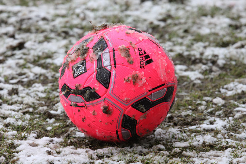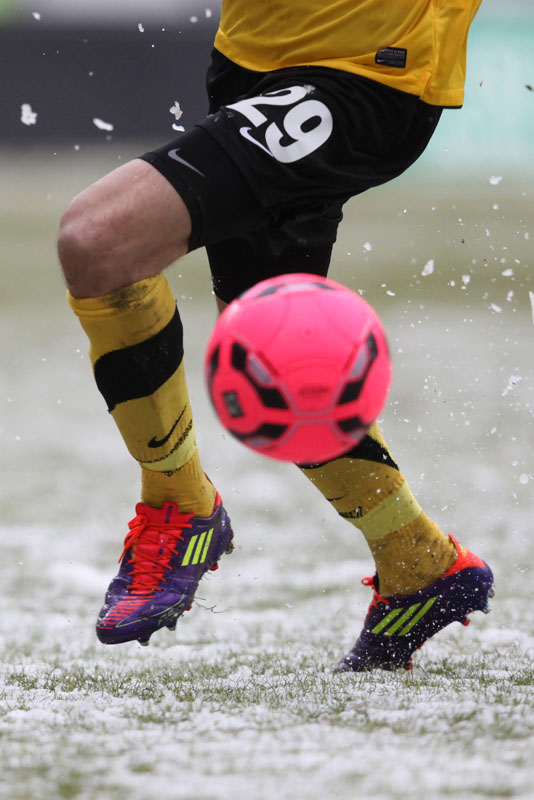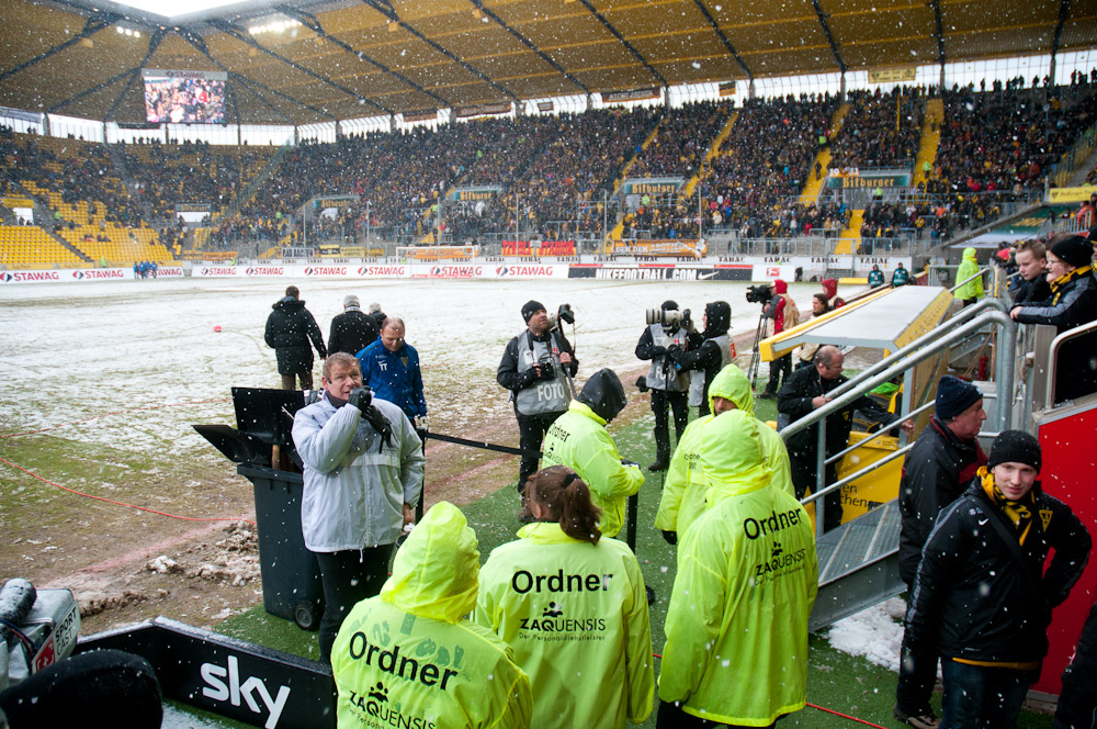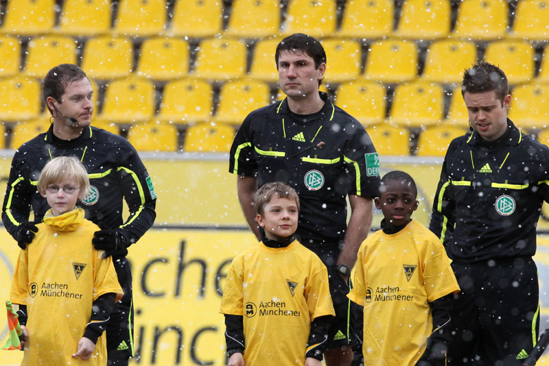 Das Wetter rund um den Tivoli war alles andere als karnevalsfreundlich. Doch damit nicht genug: Auch der Platz litt trotz seit zwei Tagen laufender Rasenheizung deutlich unter dem heftigen Schneefall. Die Verantwortlichen beider Teams verwiesen auf die irregulären Bedingungen und wollten nicht spielen, das Schiedsrichterteam pfiff die Partie trotzdem an. Um 14:10 Uhr war es dann soweit: Der Ball rollte – zumindest ansatzweise. Denn entweder blieb die Kugel auf dem seifigen Untergrund auf halber Strecke liegen, oder sie wurde plötzlich unerreichbar. Kombinationsfußball war zumindest kaum möglich, lange Bälle waren das Mittel auf beiden Seiten.